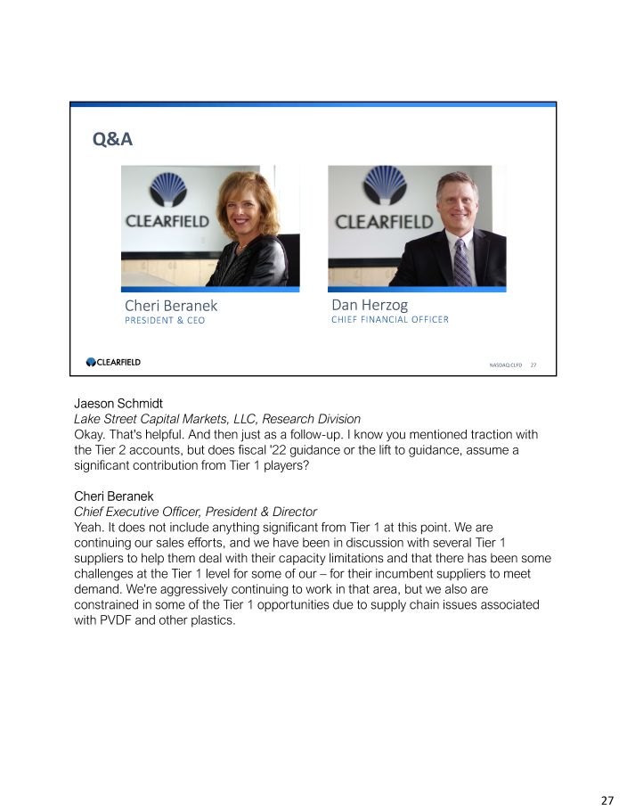 Q & A N A S DAQ:CLFD 2 7 C h e r i B e r a n e k PRESIDENT & CEO D a n H e r z o g CHIEF FINANCIAL OFFICER J a e s o n S c h m i d t L a k e S t r e e t C a p i t a l M a r k e t s , L L C , R e s ea r c h D i v i s i o n Okay. That's helpful. And then just as a follow - up. I know you mentioned traction with the Tier 2 accounts, but does fiscal '22 guidance or the lift to guidance, assume a s i g n i f i c a n t c o n t ri b u t i o n f r o m T i e r 1 p l a y e r s ? C h e ri B e r a n e k Chief Executive Officer, President & Director Yeah. It does not include anything significant from Tier 1 at this point. We are continuing our sales efforts, and we have been in discussion with several Tier 1 suppliers to help them deal with their capacity limitations and that there has been some challenges at the Tier 1 level for some of our – for their incumbent suppliers to meet demand. We're aggressively continuing to work in that area, but we also are constrained in some of the Tier 1 opportunities due to supply chain issues associated with PVDF and other plastics. 27