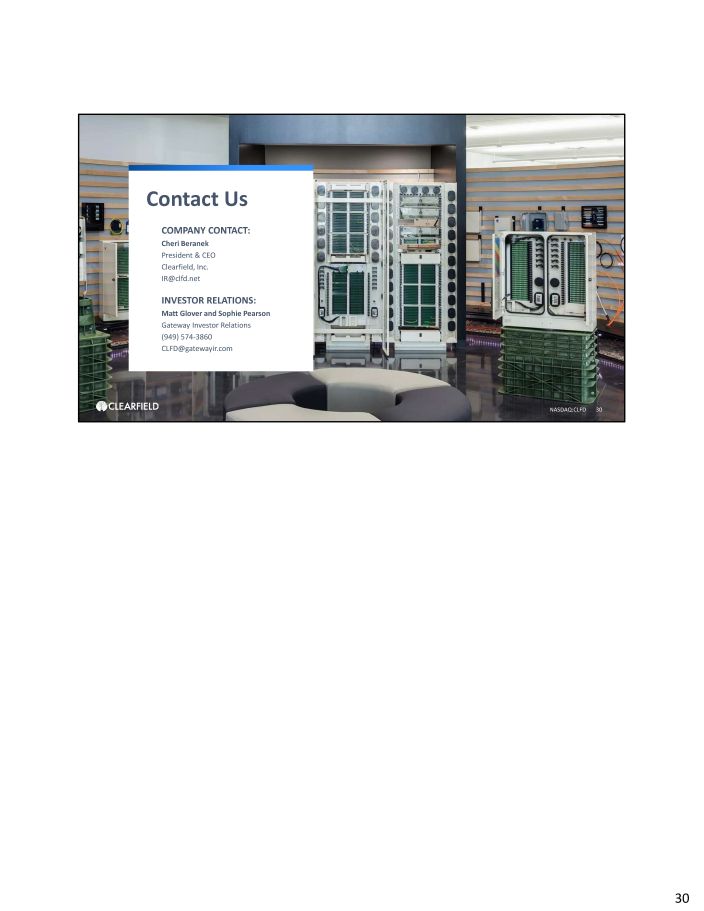 Q & A N A S DAQ:CLFD 2 9 C h e r i B e r a n e k PRESIDENT & CEO D a n H e r z o g CHIEF FINANCIAL OFFICER C h e ri B e r a n e k Chief Executive Officer, President & Director It was a wonderful opportunity to present these numbers for you today. I just want to absolutely call out the amazing work of Clearfield’s employee community, the execution on our strategy and the execution to deliver product in a scalable fashion. I think it's extraordinary, and I couldn't be more proud of what they're doing. I also wish all of you a – I'm very grateful for your support as we approach the Thanksgiving season and wish you and your families a very blessed opportunity to spend time together. Until next quarter. Operator The conference has now concluded. Thank you for attending today’s presentation. You may now disconnect. 29