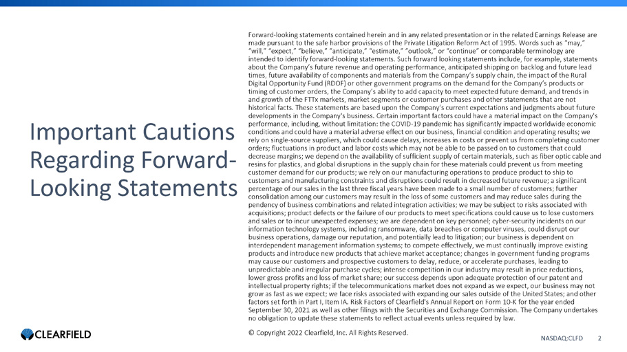 Important Cautions Regarding Forward - Looking Statements NASDAQ:CLFD 2 Forward - looking statements contained herein and in any related presentation or in the related Earnings Release are made pursuant to the safe harbor provisions of the Private Litigation Reform Act of 1995. Words such as “may,” “will,” “expect,” “believe,” “anticipate,” “estimate,” “outlook,” or “continue” or comparable terminology are intended to identify forward - looking statements. Such forward looking statements include, for example, statements about the Company’s future revenue and operating performance, anticipated shipping on backlog and future lead times, future availability of components and materials from the Company’s supply chain, the impact of the Rural Digital Opportunity Fund (RDOF) or other government programs on the demand for the Company’s products or timing of customer orders, the Company’s ability to add capacity to meet expected future demand, and trends in and growth of the FTTx markets, market segments or customer purchases and other statements that are not historical facts. These statements are based upon the Company's current expectations and judgments about future developments in the Company's business. Certain important factors could have a material impact on the Company's performance, including, without limitation: the COVID - 19 pandemic has significantly impacted worldwide economic conditions and could have a material adverse effect on our business, financial condition and operating results; we rely on single - source suppliers, which could cause delays, increases in costs or prevent us from completing customer orders; fluctuations in product and labor costs which may not be able to be passed on to customers that could decrease margins; we depend on the availability of sufficient supply of certain materials, such as fiber optic cable and resins for plastics, and global disruptions in the supply chain for these materials could prevent us from meeting customer demand for our products; we rely on our manufacturing operations to produce product to ship to customers and manufacturing constraints and disruptions could result in decreased future revenue; a significant percentage of our sales in the last three fiscal years have been made to a small number of customers; further consolidation among our customers may result in the loss of some customers and may reduce sales during the pendency of business combinations and related integration activities; we may be subject to risks associated with acquisitions; product defects or the failure of our products to meet specifications could cause us to lose customers and sales or to incur unexpected expenses; we are dependent on key personnel; cyber - security incidents on our information technology systems, including ransomware, data breaches or computer viruses, could disrupt our business operations, damage our reputation, and potentially lead to litigation; our business is dependent on interdependent management information systems; to compete effectively, we must continually improve existing products and introduce new products that achieve market acceptance; changes in government funding programs may cause our customers and prospective customers to delay, reduce, or accelerate purchases, leading to unpredictable and irregular purchase cycles; intense competition in our industry may result in price reductions, lower gross profits and loss of market share; our success depends upon adequate protection of our patent and intellectual property rights; if the telecommunications market does not expand as we expect, our business may not grow as fast as we expect; we face risks associated with expanding our sales outside of the United States; and other factors set forth in Part I, Item IA. Risk Factors of Clearfield's Annual Report on Form 10 - K for the year ended September 30, 2021 as well as other filings with the Securities and Exchange Commission. The Company undertakes no obligation to update these statements to reflect actual events unless required by law. © Copyright 2022 Clearfield, Inc. All Rights Reserved.