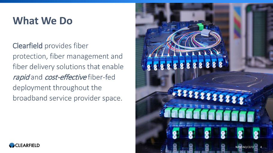 What We Do Clearfield provides fiber protection, fiber management and fiber delivery solutions that enable rapid and cost - effective fiber - fed deployment throughout the broadband service provider space. NASDAQ:CLFD 4