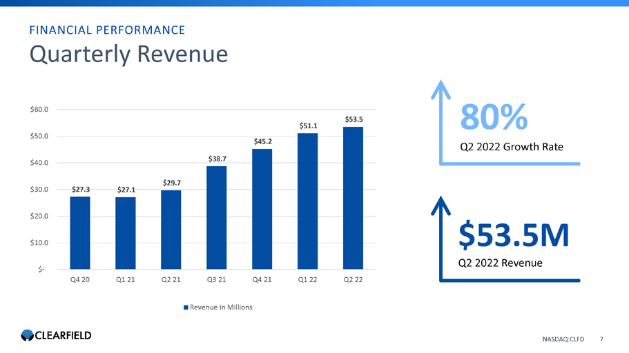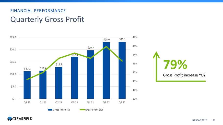 Quarterly Gross Profit $11.2 $11.4 $12.9 $17.1 $19.7 $23.0 $23.1 39% 40% 41% 42% 43% 44% 45% 46% $- $5.0 $10.0 $15.0 $20.0 $25.0 Q4 20 Q1 21 Q2 21 Q3 21 Q4 21 Q1 22 Q2 22 Gross Profit ($) Gross Profit (%) FINANCIAL PERFORMANCE 79% Gross Profit increase YOY NASDAQ:CLFD 10