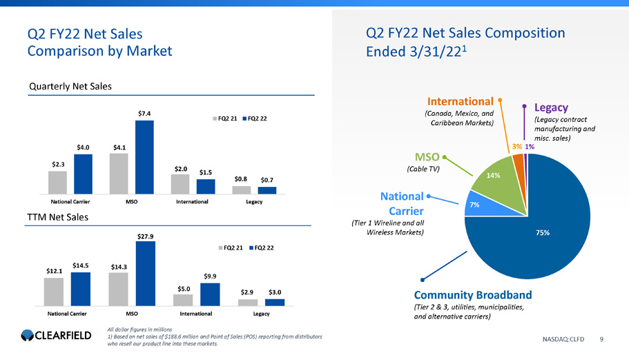 Q2 FY22 Net Sales Comparison by Market NASDAQ:CLFD All dollar figures in millions 1) Based on net sales of $188.6 million and Point of Sales (POS) reporting from distributors who resell our product line into these markets. Q2 FY22 Net Sales Composition Ended 3/31/22 1 Legacy (Legacy contract manufacturing and misc. sales) 75% 7% 14% 3% 1% $75.8 $133.2 Community Broadband FQ2 21 FQ2 22 Quarterly Net Sales TTM Net Sales Community Broadband (Tier 2 & 3, utilities, municipalities, and alternative carriers) National Carrier (Tier 1 Wireline and all Wireless Markets) MSO (Cable TV) International (Canada, Mexico, and Caribbean Markets) NASDAQ:CLFD 8 $20.6 $39.9 Community Broadband FQ2 21 FQ2 22