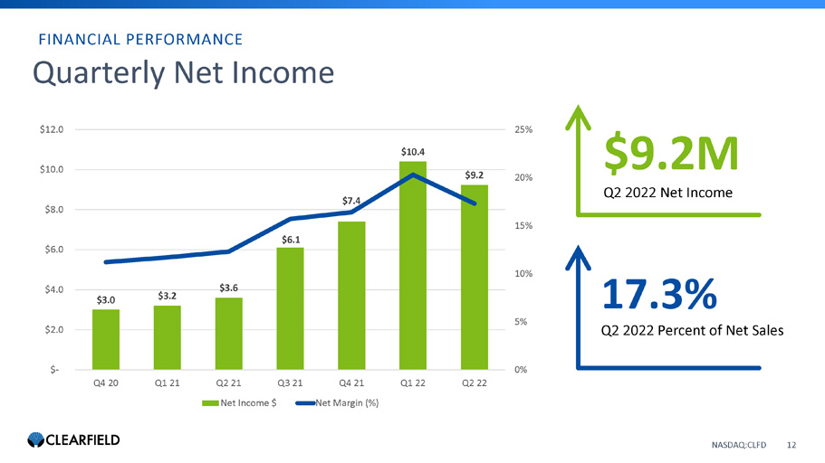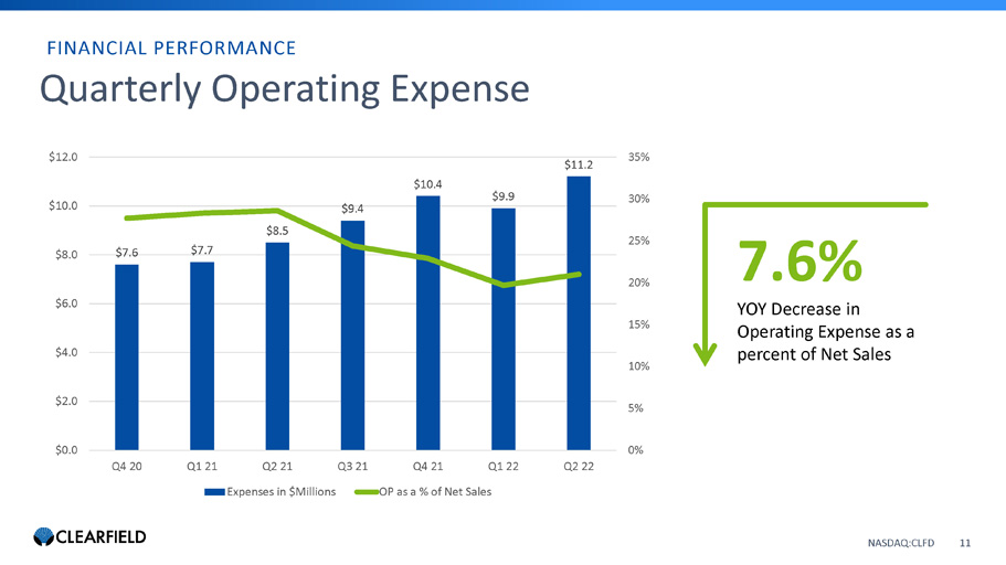$7.6 $7.7 $8.5 $9.4 $10.4 $9.9 $11.2 0% 5% 10% 15% 20% 25% 30% 35% $0.0 $2.0 $4.0 $6.0 $8.0 $10.0 $12.0 Q4 20 Q1 21 Q2 21 Q3 21 Q4 21 Q1 22 Q2 22 Expenses in $Millions OP as a % of Net Sales FINANCIAL PERFORMANCE 7.6% YOY Decrease in Operating Expense as a percent of Net Sales Quarterly Operating Expense NASDAQ:CLFD 11