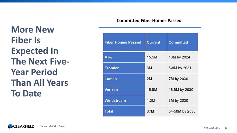 Legislation Supporting Broadband NASDAQ:CLFD 15 Source: US Congress, Benton, JD Supra, Jefferies Research, & Clearfield Company Estimates Estimated Broadband Infrastructure Subsidies with Enacted Legislation