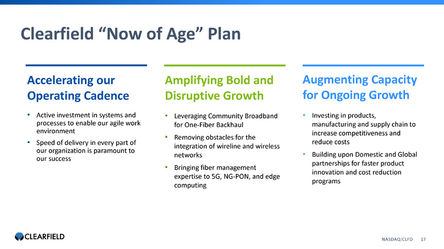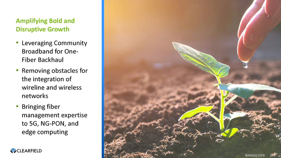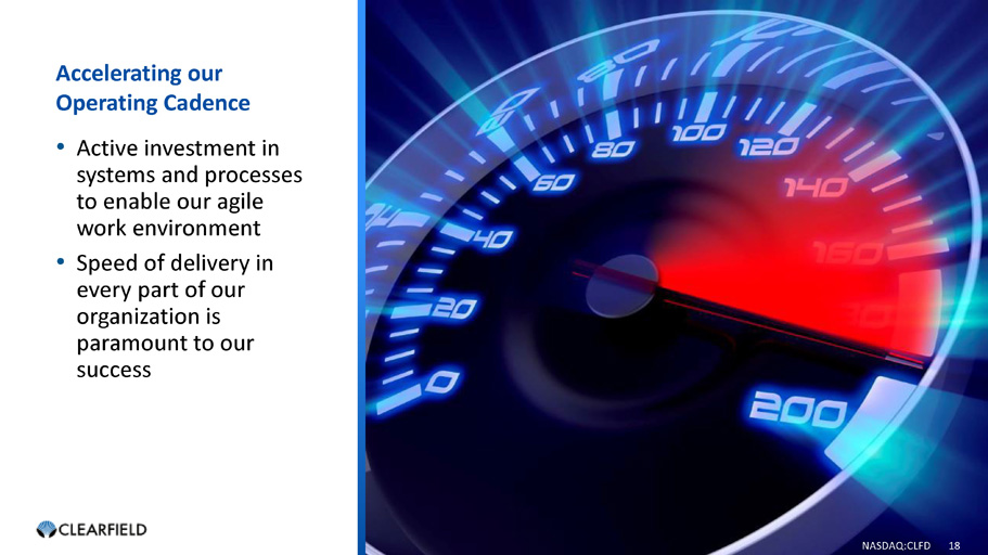 Clearfield “Now of Age” Plan NASDAQ:CLFD 17 Augmenting Capacity for Ongoing Growth • Investing in products, manufacturing and supply chain to increase competitiveness and reduce costs • Building upon Domestic and Global partnerships for faster product innovation and cost reduction programs Accelerating our Operating Cadence • Active investment in systems and processes to enable our agile work environment • Speed of delivery in every part of our organization is paramount to our success Amplifying Bold and Disruptive Growth • Leveraging Community Broadband for One - Fiber Backhaul • Removing obstacles for the integration of wireline and wireless networks • Bringing fiber management expertise to 5G, NG - PON, and edge computing