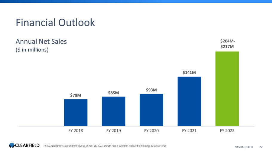 $78M $85M $93M $141M $204M - $217M FY 2018 FY 2019 FY 2020 FY 2021 FY 2022 NASDAQ:CLFD FY 2022 guidance issued and effective as of April 28, 2022; growth rate is based on midpoint of net sales guidance range Financial Outlook Annual Net Sales ($ in millions) NASDAQ:CLFD 22