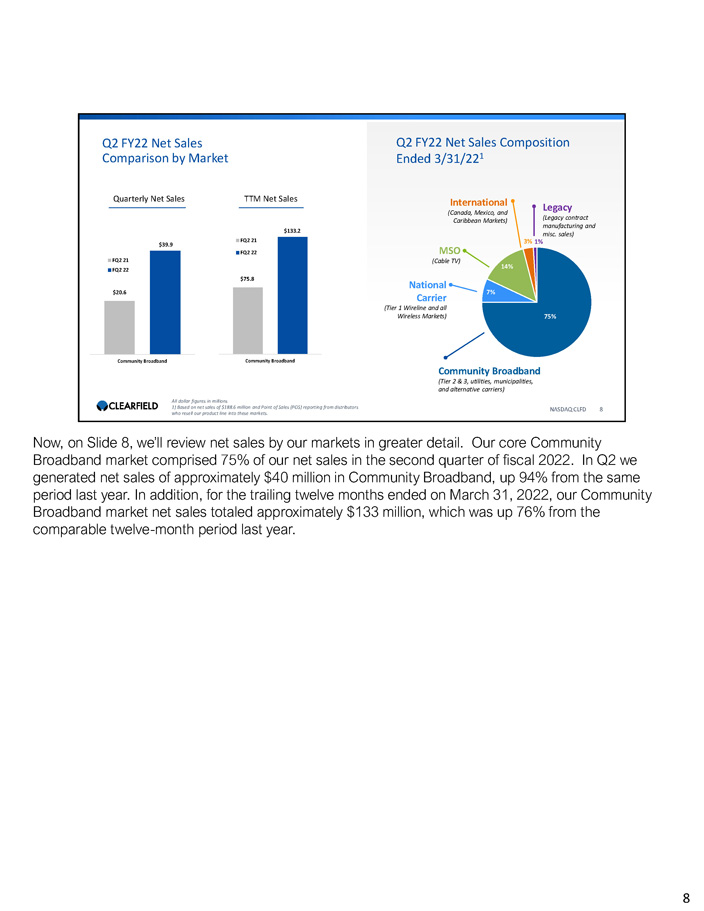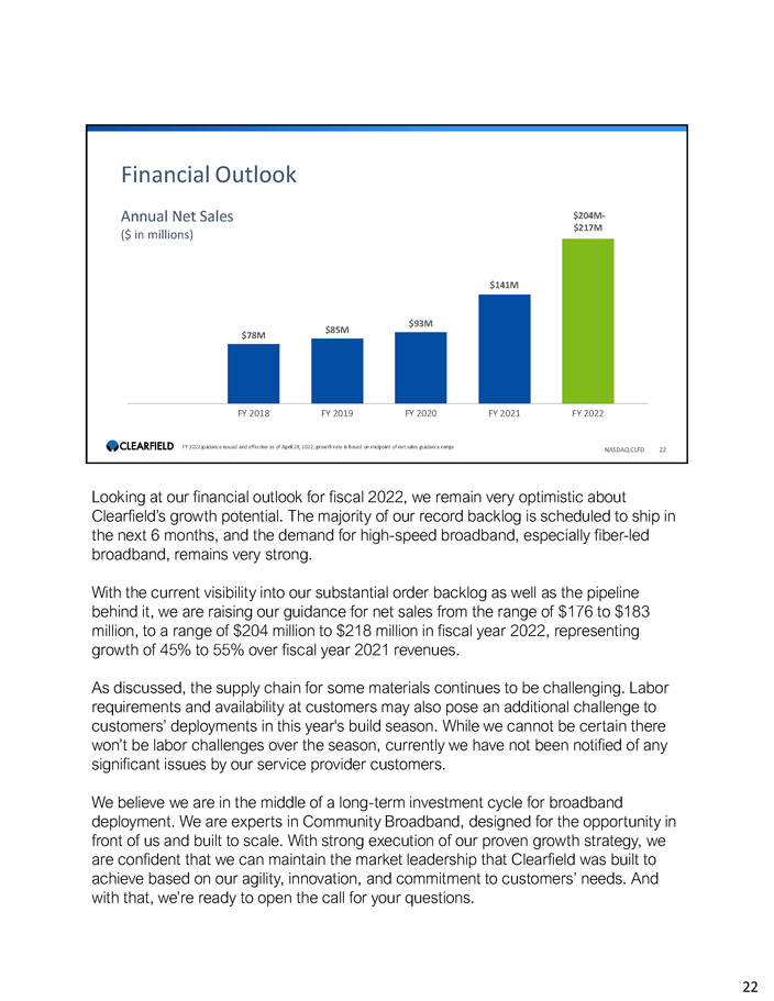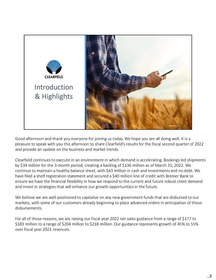 NASDAQ:CLFD 3 Introduction & Highlights Good afternoon and thank you everyone for joining us today. We hope you are all doing well. It is a pleasure to speak with you this afternoon to share Clearfield’s results for the fiscal second quarter of 2022 and provide an update on the business and market trends. Clearfield continues to execute in an environment in which demand is accelerating. Bookings led shipments by $34 million for the 3 - month period, creating a backlog of $136 million as of March 31, 2022. We continue to maintain a healthy balance sheet, with $43 million in cash and investments and no debt. We have filed a shelf registration statement and secured a $40 million line of credit with Bremer Bank to ensure we have the financial flexibility in how we respond to the current and future robust client demand and invest in strategies that will enhance our growth opportunities in the future. We believe we are well - positioned to capitalize on any new government funds that are disbursed to our markets, with some of our customers already beginning to place advanced orders in anticipation of those disbursements. For all of those reasons, we are raising our fiscal year 2022 net sales guidance from a range of $177 to $183 million to a range of $204 million to $218 million. Our guidance represents growth of 45% to 55% over fiscal year 2021 revenues. ..3