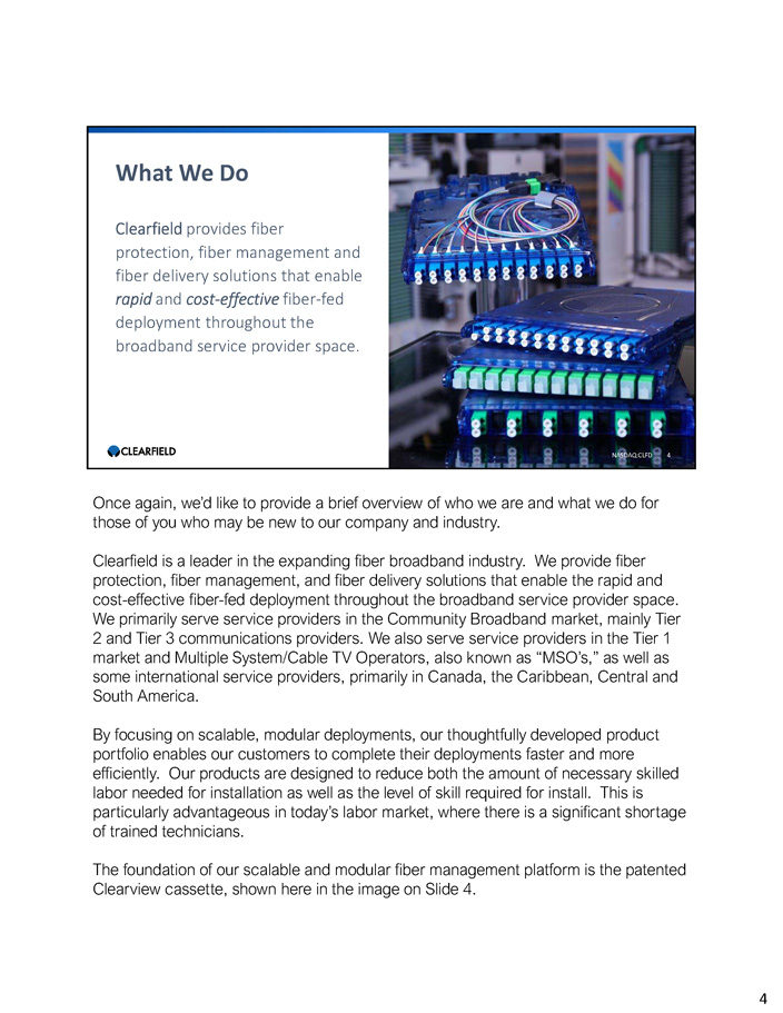 Important Cautions Regarding Forward - Looking Statements NASDAQ:CLFD 2 Forward - looking statements contained herein and in any related presentation or in the related Earnings Release are made pursuant to the safe harbor provisions of the Private Litigation Reform Act of 1995. Words such as “may,” “will,” “expect,” “believe,” “anticipate,” “estimate,” “outlook,” or “continue” or comparable terminology are intended to identify forward - looking statements. Such forward looking statements include, for example, statements about the Company’s future revenue and operating performance, anticipated shipping on backlog and future lead times, future availability of components and materials from the Company’s supply chain, the impact of the Rural Digital Opportunity Fund (RDOF) or other government programs on the demand for the Company’s products or timing of customer orders, the Company’s ability to add capacity to meet expected future demand, and trends in and growth of the FTTx markets, market segments or customer purchases and other statements that are not historical facts. These statements are based upon the Company's current expectations and judgments about future developments in the Company's business. Certain important factors could have a material impact on the Company's performance, including, without limitation: the COVID - 19 pandemic has significantly impacted worldwide economic conditions and could have a material adverse effect on our business, financial condition and operating results; we rely on single - source suppliers, which could cause delays, increases in costs or prevent us from completing customer orders; fluctuations in product and labor costs which may not be able to be passed on to customers that could decrease margins; we depend on the availability of sufficient supply of certain materials, such as fiber optic cable and resins for plastics, and global disruptions in the supply chain for these materials could prevent us from meeting customer demand for our products; we rely on our manufacturing operations to produce product to ship to customers and manufacturing constraints and disruptions could result in decreased future revenue; a significant percentage of our sales in the last three fiscal years have been made to a small number of customers; further consolidation among our customers may result in the loss of some customers and may reduce sales during the pendency of business combinations and related integration activities; we may be subject to risks associated with acquisitions; product defects or the failure of our products to meet specifications could cause us to lose customers and sales or to incur unexpected expenses; we are dependent on key personnel; cyber - security incidents on our information technology systems, including ransomware, data breaches or computer viruses, could disrupt our business operations, damage our reputation, and potentially lead to litigation; our business is dependent on interdependent management information systems; to compete effectively, we must continually improve existing products and introduce new products that achieve market acceptance; changes in government funding programs may cause our customers and prospective customers to delay, reduce, or accelerate purchases, leading to unpredictable and irregular purchase cycles; intense competition in our industry may result in price reductions, lower gross profits and loss of market share; our success depends upon adequate protection of our patent and intellectual property rights; if the telecommunications market does not expand as we expect, our business may not grow as fast as we expect; we face risks associated with expanding our sales outside of the United States; and other factors set forth in Part I, Item IA. Risk Factors of Clearfield's Annual Report on Form 10 - K for the year ended September 30, 2021 as well as other filings with the Securities and Exchange Commission. The Company undertakes no obligation to update these statements to reflect actual events unless required by law. © Copyright 2022 Clearfield, Inc. All Rights Reserved. Please note that during this call, management will be making forward - looking statements regarding future events and the future financial performance of the Company. These forward - looking statements are subject to risks and uncertainties that could cause actual results to differ materially from those in the forward - looking statements. It’s important to note also that the Company undertakes no obligation to update such statements except as required by law. The Company cautions you to consider risk factors that could cause actual results to differ materially from those in the forward - looking statements contained in today’s press release, FieldReport, and in this conference call. The risk factors section in Clearfield’s most recent Form 10 - K filing with the Securities and Exchange Commission and its subsequent filings on Form 10 - Q provides descriptions of those risks. As a reminder, the slides in this presentation are controlled by you, the listener. Please advance forward through the presentation as the speakers present their remarks. With that, I would like to turn the call over to Clearfield’s CEO, Cheri Beranek. Please proceed. 2