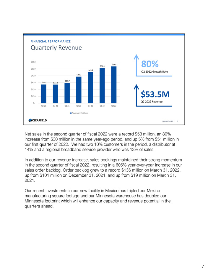 NASDAQ:CLFD 6 Financial Performance Thank you, Cheri, and good afternoon, everyone. It’s a pleasure to be speaking with you today about our second quarter of our fiscal year ‘22 results. So, looking at our second quarter financial results in more detail… 6