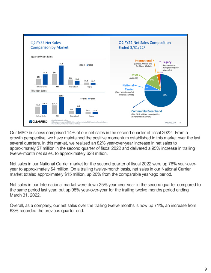 Q2 FY22 Net Sales Comparison by Market All dollar figures in millions 1) Based on net sales of $188.6 million and Point of Sales (POS) reporting from distributors who resell our product line into these markets. Q2 FY22 Net Sales Composition Ended 3/31/22 1 75% 7% 14% Legacy (Legacy contract manufacturing and misc. sales) 3% 1% $75.8 $133.2 Community Broadband FQ2 21 FQ2 22 Quarterly Net Sales TTM Net Sales Community Broadband (Tier 2 & 3, utilities, municipalities, and alternative carriers) National Carrier (Tier 1 Wireline and all Wireless Markets) MSO (Cable TV) International (Canada, Mexico, and Caribbean Markets) NASDAQ:CLFD 8 $20.6 $39.9 Community Broadband FQ2 21 FQ2 22 Now, on Slide 8, we’ll review net sales by our markets in greater detail. Our core Community Broadband market comprised 75% of our net sales in the second quarter of fiscal 2022. In Q2 we generated net sales of approximately $40 million in Community Broadband, up 94% from the same period last year. In addition, for the trailing twelve months ended on March 31, 2022, our Community Broadband market net sales totaled approximately $133 million, which was up 76% from the comparable twelve - month period last year. 8