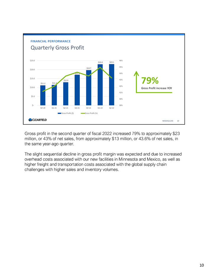 $2.3 $2.0 $0.8 $4.0 $4.1 $7.4 $1.5 $0.7 National Carrier MSO International Legacy FQ2 21 FQ2 22 Q2 FY22 Net Sales Comparison by Market Q2 FY22 Net Sales Composition Ended 3/31/22 1 75% 7% 14% Legacy (Legacy contract manufacturing and misc. sales) 3% 1% $12.1 $14.3 $5.0 $14.5 $27.9 $9.9 $2.9 $3.0 National Carrier MSO International Legacy All dollar figures in millions 1) Based on net sales of $188.6 million and Point of Sales (POS) reporting from distributors who resell our product line into these markets. FQ2 21 FQ2 22 Quarterly Net Sales TTM Net Sales Community Broadband (Tier 2 & 3, utilities, municipalities, and alternative carriers) National Carrier (Tier 1 Wireline and all Wireless Markets) MSO (Cable TV) International (Canada, Mexico, and Caribbean Markets) NASDAQ:CLFD 9 Our MSO business comprised 14% of our net sales in the second quarter of fiscal 2022. From a growth perspective, we have maintained the positive momentum established in this market over the last several quarters. In this market, we realized an 82% year - over - year increase in net sales to approximately $7 million in the second quarter of fiscal 2022 and delivered a 95% increase in trailing twelve - month net sales, to approximately $28 million. Net sales in our National Carrier market for the second quarter of fiscal 2022 were up 76% year - over - year to approximately $4 million. On a trailing twelve - month basis, net sales in our National Carrier market totaled approximately $15 million, up 20% from the comparable year - ago period. Net sales in our International market were down 25% year - over - year in the second quarter compared to the same period last year, but up 98% year - over - year for the trailing twelve months period ending March 31, 2022. Overall, as a company, our net sales over the trailing twelve months is now up 71%, an increase from 63% recorded the previous quarter end. 9