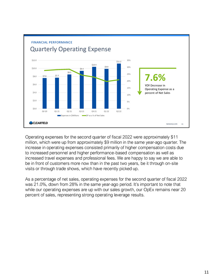 $11.2 $11.4 $12.9 $17.1 $19.7 $23.0 $23.1 39% 40% 41% 42% 43% 44% 45% 46% $ - $5.0 $10.0 $15.0 $20.0 $25.0 Q4 20 Q1 21 Q2 21 Q3 21 Q4 21 Q1 22 Q2 22 Gross Profit ($) Gross Profit (%) FINANCIAL PERFORMANCE Quarterly Gross Profit 79% Gross Profit increase YOY NASDAQ:CLFD 10 Gross profit in the second quarter of fiscal 2022 increased 79% to approximately $23 million, or 43% of net sales, from approximately $13 million, or 43.6% of net sales, in the same year - ago quarter. The slight sequential decline in gross profit margin was expected and due to increased overhead costs associated with our new facilities in Minnesota and Mexico, as well as higher freight and transportation costs associated with the global supply chain challenges with higher sales and inventory volumes. 10