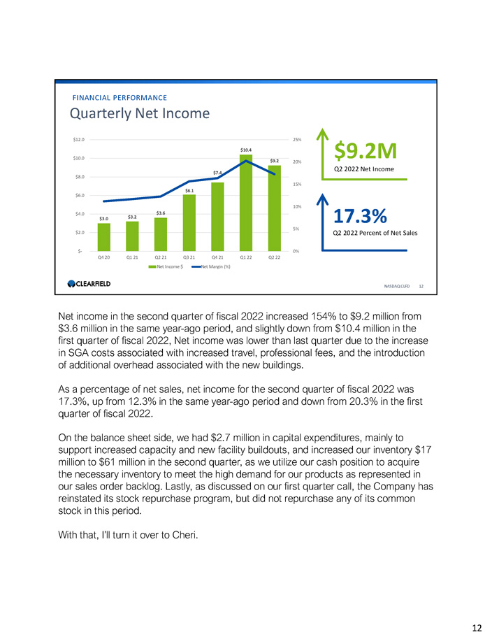 $7.6 $7.7 $8.5 $9.4 $10.4 $9.9 $11.2 0% 5% 10% 15% 20% 25% 30% 35% $0.0 $2.0 $4.0 $6.0 $8.0 $10.0 Q4 20 Q1 21 Q2 21 Q3 21 Q4 21 Q1 22 Q2 22 Expenses in $Millions OP as a % of Net Sales 7.6% YOY Decrease in Operating Expense as a percent of Net Sales FINANCIAL PERFORMANCE Quarterly Operating Expense $12.0 NASDAQ:CLFD 11 Operating expenses for the second quarter of fiscal 2022 were approximately $11 million, which were up from approximately $9 million in the same year - ago quarter. The increase in operating expenses consisted primarily of higher compensation costs due to increased personnel and higher performance - based compensation as well as increased travel expenses and professional fees. We are happy to say we are able to be in front of customers more now than in the past two years, be it through on - site visits or through trade shows, which have recently picked up. As a percentage of net sales, operating expenses for the second quarter of fiscal 2022 was 21.0%, down from 28% in the same year - ago period. It’s important to note that while our operating expenses are up with our sales growth, our OpEx remains near 20 percent of sales, representing strong operating leverage results. 11