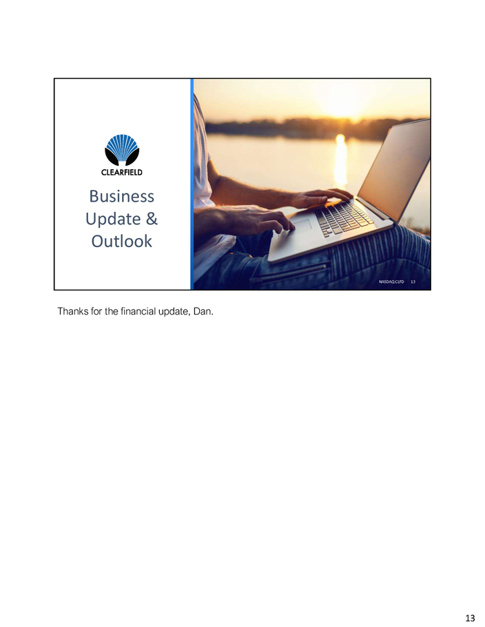 NASDAQ:CLFD 13 Business Update & Outlook Thanks for the financial update, Dan. 13