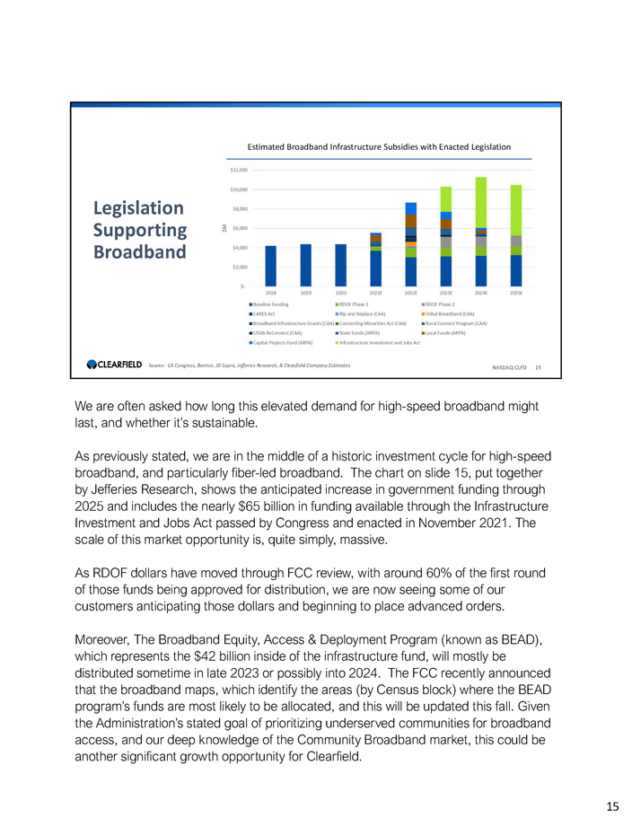 Our Value Proposition – Removing Obstacles 1. Craft - friendly – requires less skilled labor and overall labor time 2. Designed to reduce permitting and right - of - way 3. Faster turn - up time for quicker revenue per subscriber NASDAQ:CLFD 14 The Clearfield value proposition is driven by our thoughtfully designed fiber management and fiber connectivity products. We have made it our goal to remove the obstacles that would prevent our customers from adopting fiber - led broadband. Since its founding, Clearfield was built to scale. We were built for the opportunity that lies in front of us. As we mentioned, from the beginning, Clearfield has been positioned to deliver fiber products to communities that have historically been underserved or unserved – Clearfield truly IS Community Broadband. 14