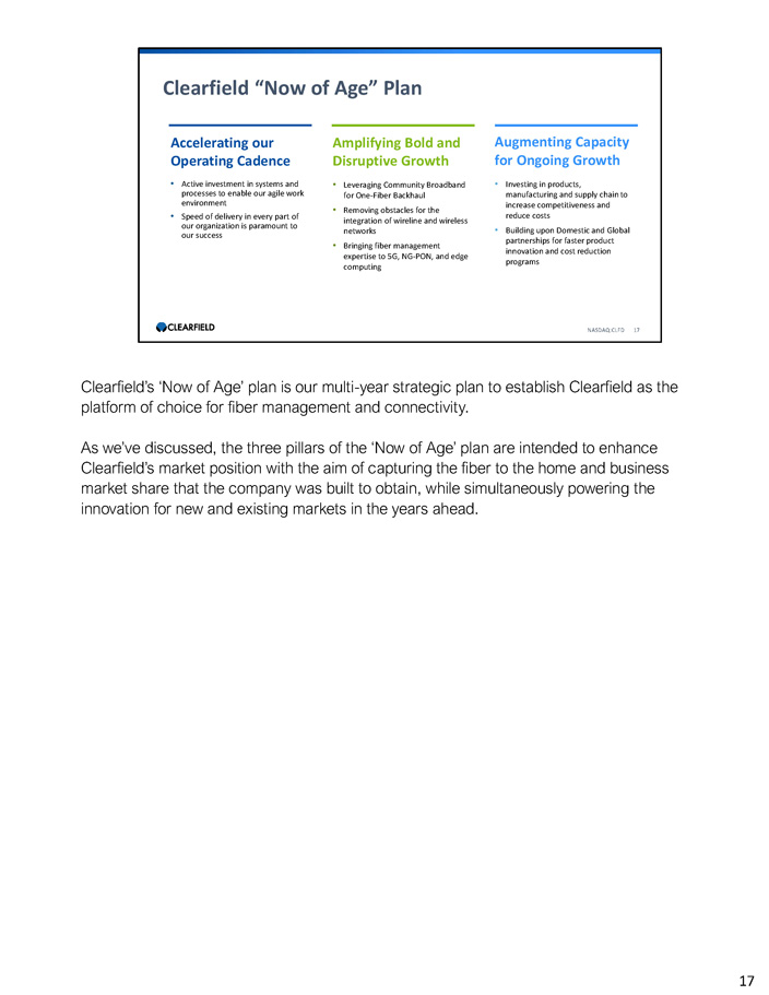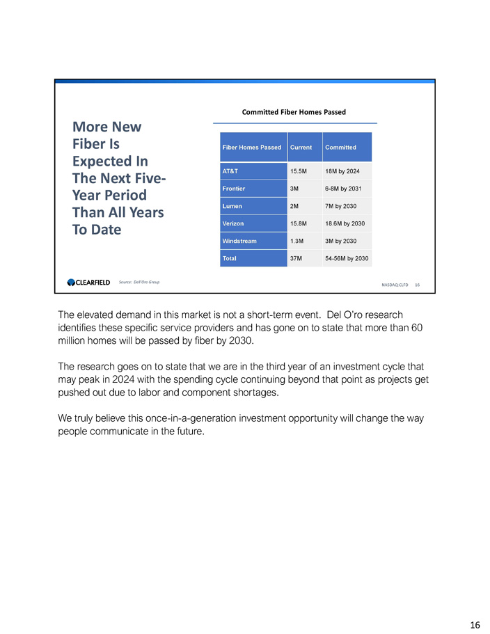 Legislation Supporting Broadband NASDAQ:CLFD 15 Source: US Congress, Benton, JD Supra, Jefferies Research, & Clearfield Company Estimates Estimated Broadband Infrastructure Subsidies with Enacted Legislation We are often asked how long this elevated demand for high - speed broadband might last, and whether it’s sustainable. As previously stated, we are in the middle of a historic investment cycle for high - speed broadband, and particularly fiber - led broadband. The chart on slide 15, put together by Jefferies Research, shows the anticipated increase in government funding through 2025 and includes the nearly $65 billion in funding available through the Infrastructure Investment and Jobs Act passed by Congress and enacted in November 2021. The scale of this market opportunity is, quite simply, massive. As RDOF dollars have moved through FCC review, with around 60% of the first round of those funds being approved for distribution, we are now seeing some of our customers anticipating those dollars and beginning to place advanced orders. Moreover, The Broadband Equity, Access & Deployment Program (known as BEAD), which represents the $42 billion inside of the infrastructure fund, will mostly be distributed sometime in late 2023 or possibly into 2024. The FCC recently announced that the broadband maps, which identify the areas (by Census block) where the BEAD program’s funds are most likely to be allocated, and this will be updated this fall. Given the Administration’s stated goal of prioritizing underserved communities for broadband access, and our deep knowledge of the Community Broadband market, this could be another significant growth opportunity for Clearfield. 15