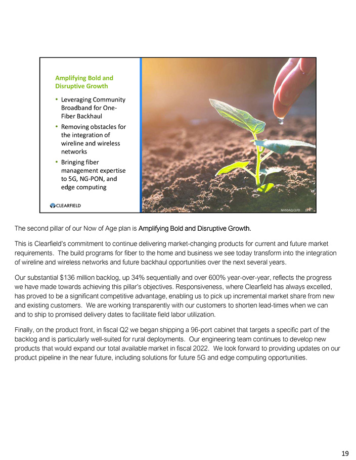 Accelerating our Operating Cadence • Active investment in systems and processes to enable our agile work environment • Speed of delivery in every part of our organization is paramount to our success NASDAQ:CLFD 18 Accelerating our Operating Cadence . This is Clearfield’s commitment to address the market’s exponential demand for fiber - fed broadband and to ensure our operations can nimbly respond to our customer demands. Our ability to deliver our products on time to our customers is crucial so that their deployment schedules are maintained and their time to revenue can accelerate. As discussed on our fiscal Q1 call, we have made significant investments in inventory to ensure that we can deliver our product on time to our promised ship dates. This in turn allows our customers to effectively manage their service technicians and the new install technicians, who are in high demand given the present labor market shortage. Customers are now working more closely with us on their mid - to long - term business plans, submitting purchase orders months in advance, providing us with increasing visibility into the particular products that they intend to deploy. As a result, we are better prepared to ship those required products so that our customers deployment schedules can stay on track. Nevertheless, we cannot overlook the fact that fiber availability continues to be challenged and supply chain issues persist across all industries. We are continuously working on ways to strengthen our relationship with our suppliers going forward. We are also making incremental investments in SG&A to effectively meet this demand. We have added key personnel to the company and are recruiting for a number of different positions throughout the company to help capture future growth. 18