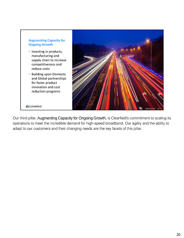 Amplifying Bold and Disruptive Growth • Leveraging Community Broadband for One - Fiber Backhaul • Removing obstacles for the integration of wireline and wireless networks • Bringing fiber management expertise to 5G, NG - PON, and edge computing NASDAQ:CLFD 19 The second pillar of our Now of Age plan is Amplifying Bold and Disruptive Growth. This is Clearfield’s commitment to continue delivering market - changing products for current and future market requirements. The build programs for fiber to the home and business we see today transform into the integration of wireline and wireless networks and future backhaul opportunities over the next several years. Our substantial $136 million backlog, up 34% sequentially and over 600% year - over - year, reflects the progress we have made towards achieving this pillar’s objectives. Responsiveness, where Clearfield has always excelled, has proved to be a significant competitive advantage, enabling us to pick up incremental market share from new and existing customers. We are working transparently with our customers to shorten lead - times when we can and to ship to promised delivery dates to facilitate field labor utilization. Finally, on the product front, in fiscal Q2 we began shipping a 96 - port cabinet that targets a specific part of the backlog and is particularly well - suited for rural deployments. Our engineering team continues to develop new products that would expand our total available market in fiscal 2022. We look forward to providing updates on our product pipeline in the near future, including solutions for future 5G and edge computing opportunities. 19