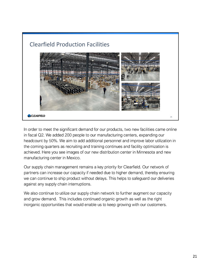 Clearfield Production Facilities 21 21 In order to meet the significant demand for our products, two new facilities came online in fiscal Q2. We added 200 people to our manufacturing centers, expanding our headcount by 50%. We aim to add additional personnel and improve labor utilization in the coming quarters as recruiting and training continues and facility optimization is achieved. Here you see images of our new distribution center in Minnesota and new manufacturing center in Mexico. Our supply chain management remains a key priority for Clearfield. Our network of partners can increase our capacity if needed due to higher demand, thereby ensuring we can continue to ship product without delays. This helps to safeguard our deliveries against any supply chain interruptions. We also continue to utilize our supply chain network to further augment our capacity and grow demand. This includes continued organic growth as well as the right inorganic opportunities that would enable us to keep growing with our customers.