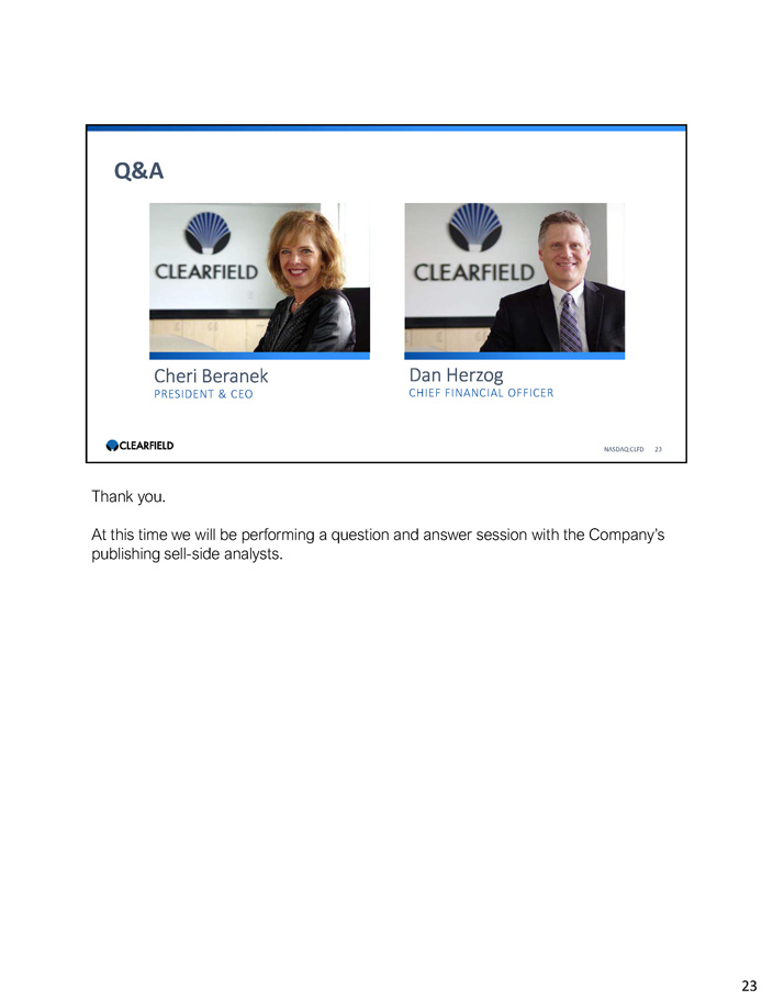 Q&A NASDAQ:CLFD 23 Cheri Beranek PRESIDENT & CEO Dan Herzog CHIEF FINANCIAL OFFICER Thank you. At this time we will be performing a question and answer session with the Company’s publishing sell - side analysts. 23