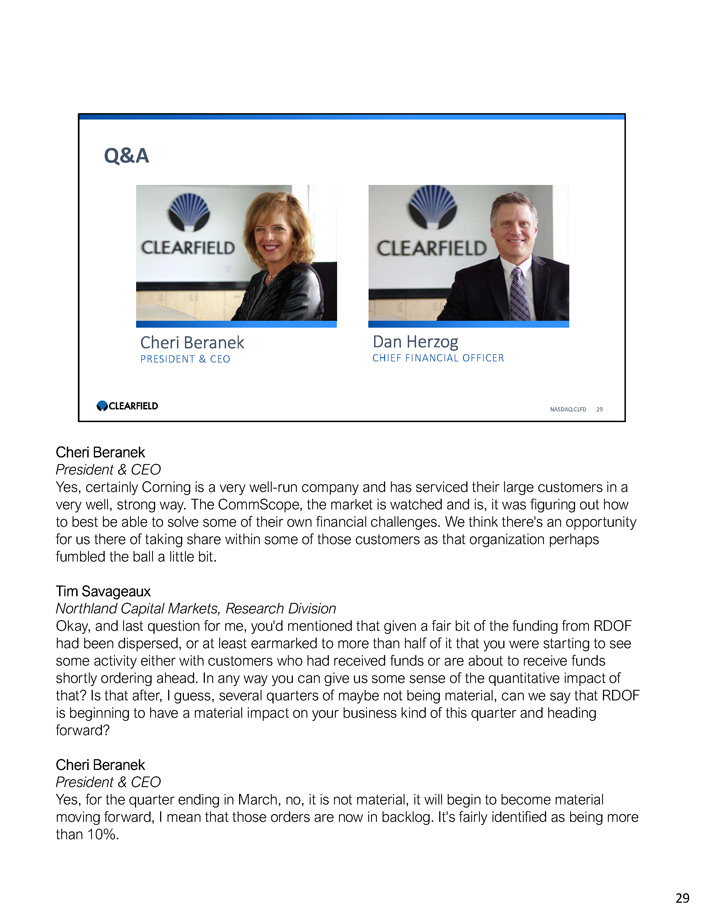Q&A NASDAQ:CLFD 28 Cheri Beranek PRESIDENT & CEO Dan Herzog CHIEF FINANCIAL OFFICER Cheri Beranek President & CEO We're really trying to get our hands around that. Because we, I mean historically, of course, Corning was the big dog in the market and they were the big dog because of AT&T and Verizon being the predominant deployer. Today in this market those organizations still being very strong, delivery agents to fiber to the home. There's so many more. And there's so many parts of our world about what community broadband is in place. Corning talked about 20% incremental growth, and they had a 20% growth rate this year, over last year. So what we're trying to get our hands around with is that at growing at 80% over last year, we're nowhere, we know that we're taking share, and we need to be able to identify how we're taking that share, keeping that share sticky, establishing the organizational capacity by which to grow with that. So those are figures that we hope to be able to put together and perhaps provide at a later call. But at this point, it's more of our research, and most importantly, just working to make sure we can continue to build capacity factor. Tim Savageaux Northland Capital Markets, Research Division Got it. And while we're on Corning, what are you seeing out of your kind of traditional larger competitors in the community broadband market these days, Corning and likely CommScope as well. Any change that's notable in their behavior, are they kind of tied up with the big tier one or what happened? 28