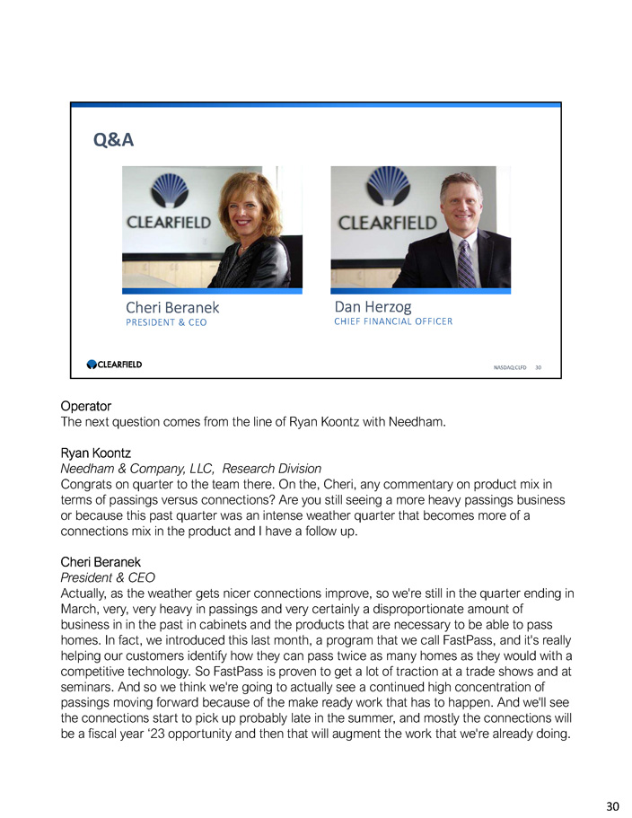 Q&A NASDAQ:CLFD 30 Cheri Beranek PRESIDENT & CEO Dan Herzog CHIEF FINANCIAL OFFICER Operator The next question comes from the line of Ryan Koontz with Needham. Ryan Koontz Needham & Company, LLC, Research Division Congrats on quarter to the team there. On the, Cheri, any commentary on product mix in terms of passings versus connections? Are you still seeing a more heavy passings business or because this past quarter was an intense weather quarter that becomes more of a connections mix in the product and I have a follow up. Cheri Beranek President & CEO Actually, as the weather gets nicer connections improve, so we're still in the quarter ending in March, very, very heavy in passings and very certainly a disproportionate amount of business in in the past in cabinets and the products that are necessary to be able to pass homes. In fact, we introduced this last month, a program that we call FastPass, and it's really helping our customers identify how they can pass twice as many homes as they would with a competitive technology. So FastPass is proven to get a lot of traction at a trade shows and at seminars. And so we think we're going to actually see a continued high concentration of passings moving forward because of the make ready work that has to happen. And we'll see the connections start to pick up probably late in the summer, and mostly the connections will be a fiscal year ‘23 opportunity and then that will augment the work that we're already doing. 30