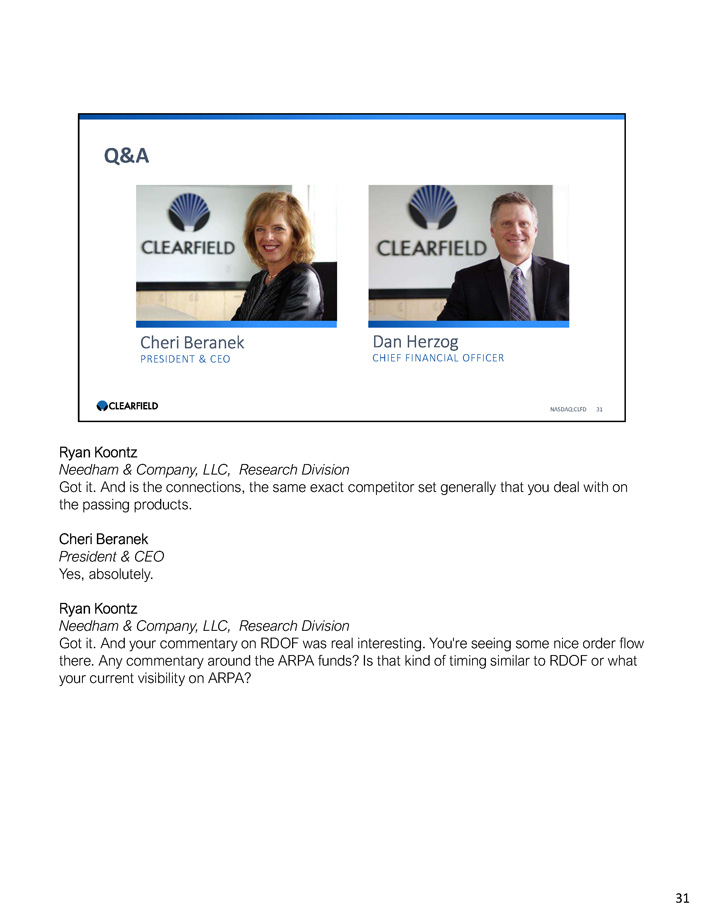 Q&A NASDAQ:CLFD 31 Cheri Beranek PRESIDENT & CEO Dan Herzog CHIEF FINANCIAL OFFICER Ryan Koontz Needham & Company, LLC, Research Division Got it. And is the connections, the same exact competitor set generally that you deal with on the passing products. Cheri Beranek President & CEO Yes, absolutely. Ryan Koontz Needham & Company, LLC, Research Division Got it. And your commentary on RDOF was real interesting. You're seeing some nice order flow there. Any commentary around the ARPA funds? Is that kind of timing similar to RDOF or what your current visibility on ARPA? 31