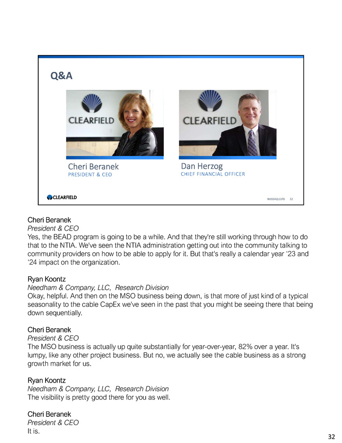 Q&A NASDAQ:CLFD 32 Cheri Beranek PRESIDENT & CEO Dan Herzog CHIEF FINANCIAL OFFICER Cheri Beranek President & CEO Yes, the BEAD program is going to be a while . And that they're still working through how to do that to the NTIA . We've seen the NTIA administration getting out into the community talking to community providers on how to be able to apply for it . But that's really a calendar year ‘ 23 and ‘ 24 impact on the organization . Ryan Koontz Needham & Company, LLC, Research Division Okay, helpful. And then on the MSO business being down, is that more of just kind of a typical seasonality to the cable CapEx we've seen in the past that you might be seeing there that being down sequentially. Cheri Beranek President & CEO The MSO business is actually up quite substantially for year - over - year, 82% over a year. It's lumpy, like any other project business. But no, we actually see the cable business as a strong growth market for us. Ryan Koontz Needham & Company, LLC, Research Division The visibility is pretty good there for you as well. Cheri Beranek President & CEO It is. 32