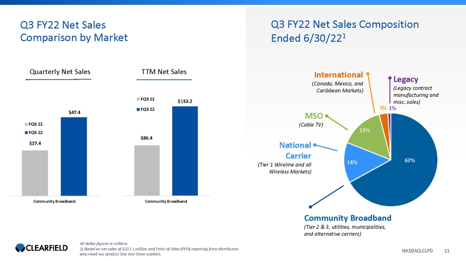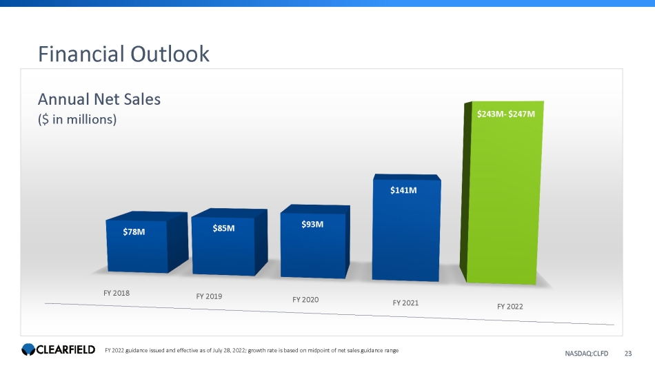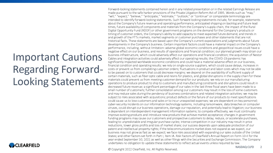 Important Cautions Regarding Forward - Looking Statements NASDAQ:CLFD 2 Forward - looking statements contained herein and in any related presentation or in the related Earnings Release are made pursuant to the safe harbor provisions of the Private Litigation Reform Act of 1995. Words such as “may,” “will,” “expect,” “believe,” “anticipate,” “estimate,” “outlook,” or “continue” or comparable terminology are intended to identify forward - looking statements. Such forward looking statements include, for example, statements about the Company’s future revenue and operating performance, anticipated shipping on backlog and future lead times, future availability of components and materials from the Company’s supply chain, the impact of the Rural Digital Opportunity Fund (RDOF) or other government programs on the demand for the Company’s products or timing of customer orders, the Company’s ability to add capacity to meet expected future demand, and trends in and growth of the FTTx markets, market segments or customer purchases and other statements that are not historical facts. These statements are based upon the Company's current expectations and judgments about future developments in the Company's business. Certain important factors could have a material impact on the Company's performance, including, without limitation: adverse global economic conditions and geopolitical issues could have a negative effect on our business, and results of operations and financial condition; our planned growth may strain our business infrastructure, which could adversely affect our operations and financial condition; the acquisition of Nestor Cables and integration activities could adversely affect our operating results; the COVID - 19 pandemic has significantly impacted worldwide economic conditions and could have a material adverse effect on our business, financial condition and operating results; we rely on single - source suppliers, which could cause delays, increases in costs or prevent us from completing customer orders; fluctuations in product and labor costs which may not be able to be passed on to customers that could decrease margins; we depend on the availability of sufficient supply of certain materials, such as fiber optic cable and resins for plastics, and global disruptions in the supply chain for these materials could prevent us from meeting customer demand for our products; we rely on our manufacturing operations to produce product to ship to customers and manufacturing constraints and disruptions could result in decreased future revenue; a significant percentage of our sales in the last three fiscal years have been made to a small number of customers; further consolidation among our customers may result in the loss of some customers and may reduce sales during the pendency of business combinations and related integration activities; we may be subject to risks associated with acquisitions; product defects or the failure of our products to meet specifications could cause us to lose customers and sales or to incur unexpected expenses; we are dependent on key personnel; cyber - security incidents on our information technology systems, including ransomware, data breaches or computer viruses, could disrupt our business operations, damage our reputation, and potentially lead to litigation; our business is dependent on interdependent management information systems; to compete effectively, we must continually improve existing products and introduce new products that achieve market acceptance; changes in government funding programs may cause our customers and prospective customers to delay, reduce, or accelerate purchases, leading to unpredictable and irregular purchase cycles; intense competition in our industry may result in price reductions, lower gross profits and loss of market share; our success depends upon adequate protection of our patent and intellectual property rights; if the telecommunications market does not expand as we expect, our business may not grow as fast as we expect; we face risks associated with expanding our sales outside of the United States; and other factors set forth in Part I, Item IA. Risk Factors of Clearfield's Annual Report on Form 10 - K for the year ended September 30, 2021 as well as other filings with the Securities and Exchange Commission. The Company undertakes no obligation to update these statements to reflect actual events unless required by law. © Copyright 2022 Clearfield, Inc. All Rights Reserved.