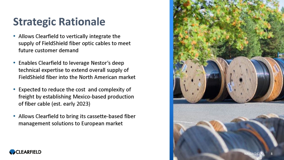 Nestor Cables Overview NASDAQ:CLFD 7 • Founded by cable technology professionals to preserve the Finnish tradition of producing high - quality fiber optic cables • One of the leading developers and manufacturers of fiber optic cable solutions in Northern Europe • Longstanding industry reputation for r eliable and flexible deliveries, quick reaction times, and operational efficiency • FY 2021 revenue: EUR €31.7 million (approximately $33 million) under Finnish Accounting Standards • Transaction value with fees : $23 million • Nestor will operate as a subsidiary of Clearfield Nestor Products Connectivity products for fiber optic networks Microducts and bundles Fiber optic cables