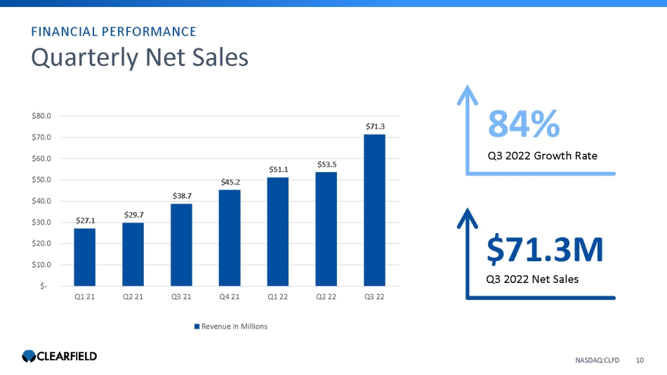 Quarterly Net Sales $27.1 $29.7 $38.7 $45.2 $51.1 $53.5 $71.3 $- $10.0 $20.0 $30.0 $40.0 $50.0 $60.0 $70.0 $80.0 Q1 21 Q2 21 Q3 21 Q4 21 Q1 22 Q2 22 Q3 22 Revenue in Millions FINANCIAL PERFORMANCE 84% Q3 2022 Growth Rate $71.3M Q3 2022 Net Sales NASDAQ:CLFD 10