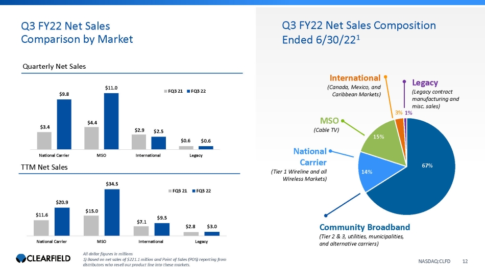 Q3 FY22 Net Sales Comparison by Market NASDAQ:CLFD All dollar figures in millions 1) Based on net sales of $221.1 million and Point of Sales (POS) reporting from distributors who resell our product line into these markets. Q3 FY22 Net Sales Composition Ended 6/30/22 1 Legacy (Legacy contract manufacturing and misc. sales) 67% 14% 15% 3% 1% $86.4 $153.2 Community Broadband FQ3 21 FQ3 22 Quarterly Net Sales TTM Net Sales Community Broadband (Tier 2 & 3, utilities, municipalities, and alternative carriers) National Carrier (Tier 1 Wireline and all Wireless Markets) MSO (Cable TV) International (Canada, Mexico, and Caribbean Markets) NASDAQ:CLFD 11 $27.4 $47.4 Community Broadband FQ3 21 FQ3 22
