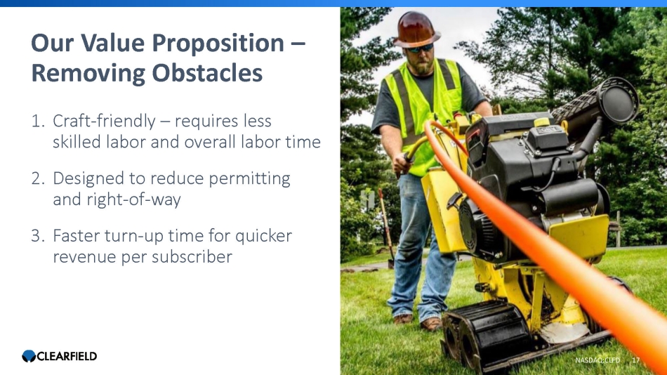 Our Value Proposition – Removing Obstacles 1. Craft - friendly – requires less skilled labor and overall labor time 2. Designed to reduce permitting and right - of - way 3. Faster turn - up time for quicker revenue per subscriber NASDAQ:CLFD 17