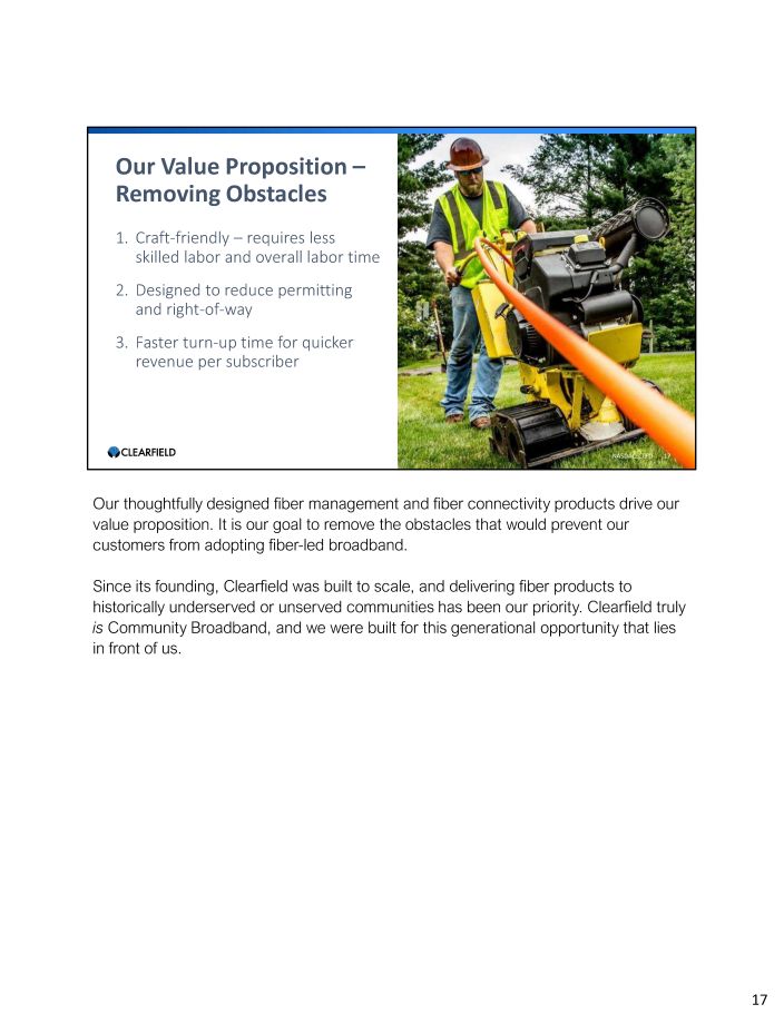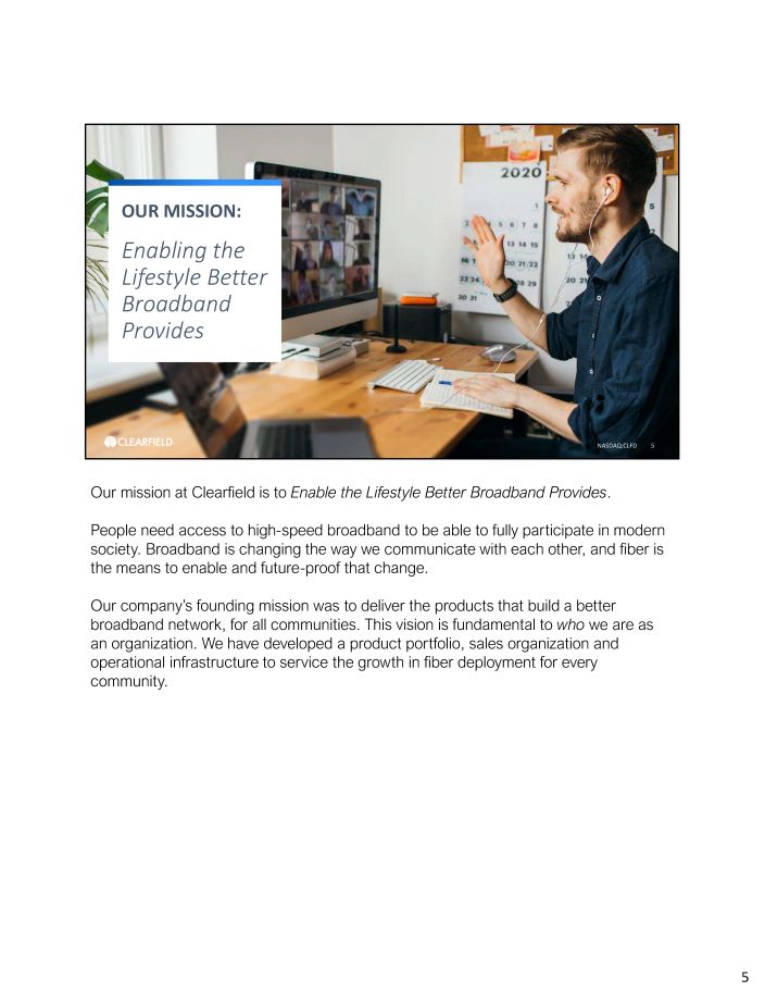 OUR MISSION: Enabling the Lifestyle Better Broadband Provides NASDAQ:CLFD 5 Our mission at Clearfield is to Enable the Lifestyle Better Broadband Provides . People need access to high - speed broadband to be able to fully participate in modern society . Broadband is changing the way we communicate with each other, and fiber is the means to enable and future - proof that change . Our company’s founding mission was to deliver the products that build a better broadband network, for all communities. This vision is fundamental to who we are as an organization. We have developed a product portfolio, sales organization and operational infrastructure to service the growth in fiber deployment for every community. 5