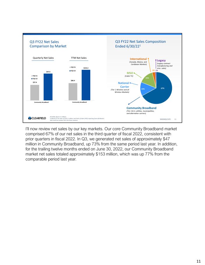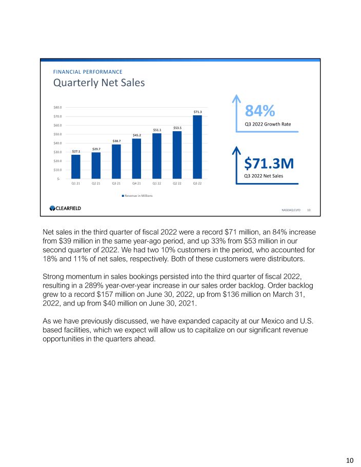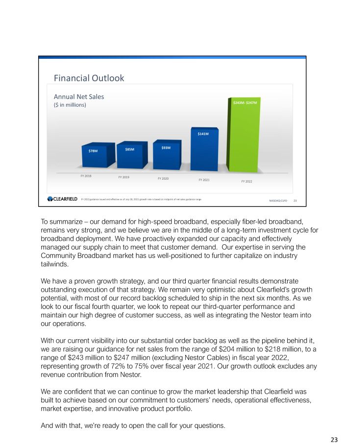 NASDAQ:CLFD 3 Introduction & Highlights Thanks, Sophie. Good afternoon and thank you everyone for joining us today. It is such a pleasure to speak with you this afternoon to share Clearfield’s results for the fiscal third quarter of 2022 and provide an update on our business and the trends we are seeing in the market. As evidenced by our strong Q3 financial results, including record net sales of $71.3 million, the demand for high - speed broadband remains robust and continues to accelerate. Not only does demand for broadband continue to be exceptionally strong, but we continue to execute on our ‘Now of Age’ strategic plan to expand capacity and rapidly scale our business to meet the bourgeoning market demand. In May 2022, we announced an agreement for the strategic acquisition of Finnish fiber optic cable manufacturer, Nestor Cables Oy, a strategic supplier of our FieldShield product line. Our synergistic relationship with Nestor spans over a decade. The acquisition, which closed on July 26, 2022 enables us to vertically integrate the design and supply of FieldShield cable to meet future customer demand. In a few minutes I will go into greater detail on Nestor’s business and what this acquisition means for the future of Clearfield, but first I would like to welcome the Nestor team to Clearfield. We are thrilled to have you working alongside us. In addition to our record net sales in Q3, we also increased our quarter - end backlog by 16% from the prior quarter, to a record $157 million. As I have said previously, we truly believe we are experiencing a once - in - a - generation investment opportunity in our industry, and we believe Clearfield is well - positioned to capitalize on this growth. Our product portfolio was carefully developed for this opportunity, and our customers have responded enthusiastically. With our continued strong execution, broadband industry tailwinds, and with our current visibility into this quarter, we are raising our fiscal year 2022 net sales guidance to a range of $ 243 million to $ 247 million . Our net sales guidance represents growth of 72 % to 75 % over fiscal year 2021 . 3