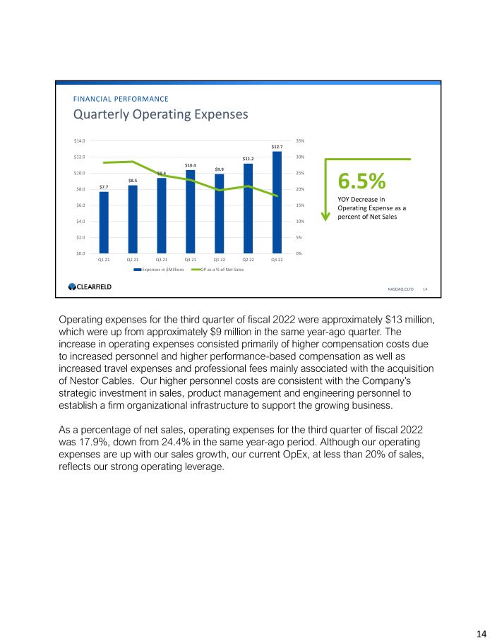 $11.4 $12.9 $17.1 $19.7 $23.0 $23.2 $29.3 15% 20% 25% 30% 35% 40% 45% $ - $5.0 $10.0 $15.0 $20.0 $25.0 $30.0 $35.0 Q1 21 Q2 21 Q3 21 Q4 21 Q1 22 Q2 22 Q3 22 Gross Profit ($) Gross Profit (%) FINANCIAL PERFORMANCE Quarterly Gross Profit 71% Gross Profit increase YOY NASDAQ:CLFD 13 Gross profit in the third quarter of fiscal 2022 increased 71% to approximately $29 million, or 41.1% of net sales, from approximately $17 million, or 44.2% of net sales, in the same year - ago quarter. As expected, overhead costs associated with the first full quarter of our new facilities in Minnesota and Mexico negatively impacted gross margins. Alongside real estate costs, increased shipping costs and inflationary increases in some components negatively affected margins. Our strategic investment in our growing national carrier business will negatively affect margin for the near future. We anticipate margins at these levels for the coming quarters, not including Nestor Cables. 13