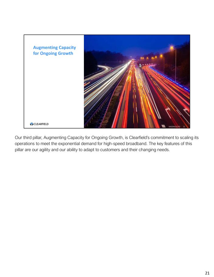 Amplifying Bold and Disruptive Growth NASDAQ:CLFD 20 Amplifying Bold and Disruptive Growth is the second pillar in our Now of Age plan. This objective reflects Clearfield’s commitment to continue delivering market - changing products for current and future market requirements. The build programs for fiber to the home and business we see today transform into the integration of wireline and wireless networks and future backhaul opportunities over the next several years. Our record $157 million backlog, up 16% sequentially and 289% year - over - year, reflects the progress we have made towards achieving this pillar’s objectives. Our products provide customers with the flexibility to scale their deployments at a pace that suits their deployment schedules. Thanks to our ability to quickly and effectively respond to customer needs, we have been able to add incremental market share from new and existing customers. Our business is healthy with demonstrated scalability – but our world is not. Contractor labor availability is still restricted; various material supply chain challenges are constant. As a result, we are working closely with our customers to ensure we have the capacity required to meet their needs without overextending our overhead costs. With our market growing at an amazing annually rate, we will aim to further expand our share of that growing market. 20