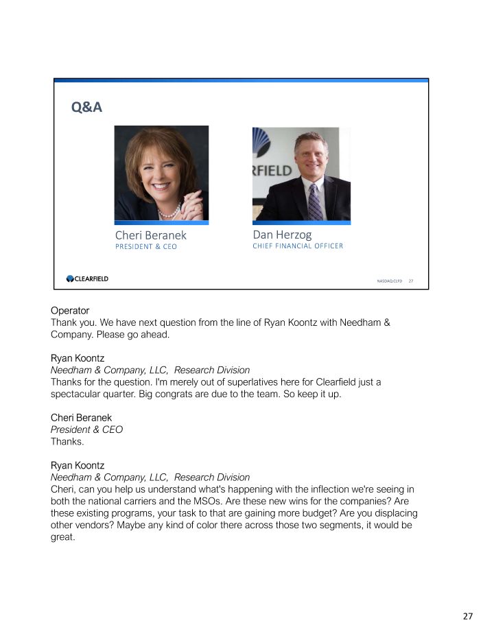 Q&A NASDAQ:CLFD 27 Cheri Beranek PRESIDENT & CEO Dan Herzog CHIEF FINANCIAL OFFICER Operator Thank you. We have next question from the line of Ryan Koontz with Needham & Company. Please go ahead. Ryan Koontz Needham & Company, LLC, Research Division Thanks for the question. I'm merely out of superlatives here for Clearfield just a spectacular quarter. Big congrats are due to the team. So keep it up. Cheri Beranek President & CEO Thanks. Ryan Koontz Needham & Company, LLC, Research Division Cheri, can you help us understand what's happening with the inflection we're seeing in both the national carriers and the MSOs. Are these new wins for the companies? Are these existing programs, your task to that are gaining more budget? Are you displacing other vendors? Maybe any kind of color there across those two segments, it would be great. 27