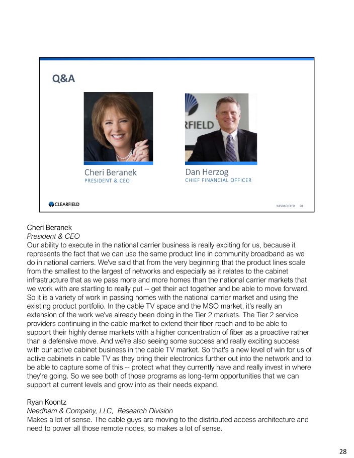Q&A NASDAQ:CLFD 28 Cheri Beranek PRESIDENT & CEO Dan Herzog CHIEF FINANCIAL OFFICER Cheri Beranek President & CEO Our ability to execute in the national carrier business is really exciting for us, because it represents the fact that we can use the same product line in community broadband as we do in national carriers. We've said that from the very beginning that the product lines scale from the smallest to the largest of networks and especially as it relates to the cabinet infrastructure that as we pass more and more homes than the national carrier markets that we work with are starting to really put - - get their act together and be able to move forward. So it is a variety of work in passing homes with the national carrier market and using the existing product portfolio. In the cable TV space and the MSO market, it's really an extension of the work we've already been doing in the Tier 2 markets. The Tier 2 service providers continuing in the cable market to extend their fiber reach and to be able to support their highly dense markets with a higher concentration of fiber as a proactive rather than a defensive move. And we're also seeing some success and really exciting success with our active cabinet business in the cable TV market. So that's a new level of win for us of active cabinets in cable TV as they bring their electronics further out into the network and to be able to capture some of this - - protect what they currently have and really invest in where they're going. So we see both of those programs as long - term opportunities that we can support at current levels and grow into as their needs expand. Ryan Koontz Needham & Company, LLC, Research Division Makes a lot of sense. The cable guys are moving to the distributed access architecture and need to power all those remote nodes, so makes a lot of sense. 28