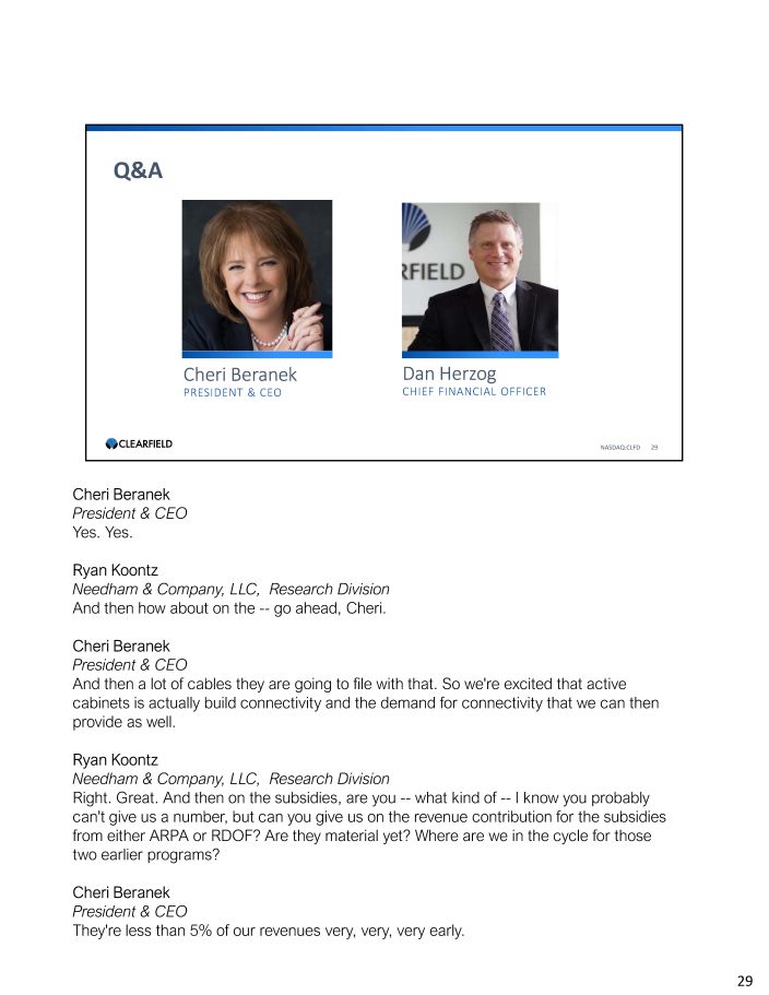 Q&A NASDAQ:CLFD 29 Cheri Beranek PRESIDENT & CEO Dan Herzog CHIEF FINANCIAL OFFICER Cheri Beranek President & CEO Yes. Yes. Ryan Koontz Needham & Company, LLC, Research Division And then how about on the - - go ahead, Cheri. Cheri Beranek President & CEO And then a lot of cables they are going to file with that. So we're excited that active cabinets is actually build connectivity and the demand for connectivity that we can then provide as well. Ryan Koontz Needham & Company, LLC, Research Division Right. Great. And then on the subsidies, are you -- what kind of - - I know you probably can't give us a number, but can you give us on the revenue contribution for the subsidies from either ARPA or RDOF? Are they material yet? Where are we in the cycle for those two earlier programs? Cheri Beranek President & CEO They're less than 5% of our revenues very, very, very early. 29