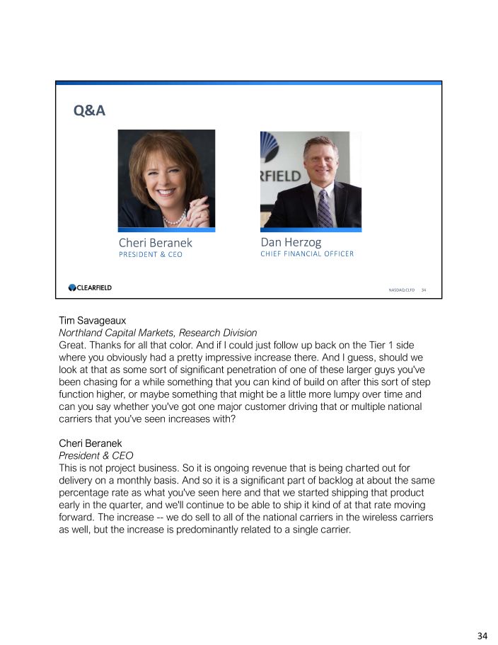 Q&A NASDAQ:CLFD 34 Cheri Beranek PRESIDENT & CEO Dan Herzog CHIEF FINANCIAL OFFICER Tim Savageaux Northland Capital Markets, Research Division Great. Thanks for all that color. And if I could just follow up back on the Tier 1 side where you obviously had a pretty impressive increase there. And I guess, should we look at that as some sort of significant penetration of one of these larger guys you've been chasing for a while something that you can kind of build on after this sort of step function higher, or maybe something that might be a little more lumpy over time and can you say whether you've got one major customer driving that or multiple national carriers that you've seen increases with? Cheri Beranek President & CEO This is not project business. So it is ongoing revenue that is being charted out for delivery on a monthly basis. And so it is a significant part of backlog at about the same percentage rate as what you've seen here and that we started shipping that product early in the quarter, and we'll continue to be able to ship it kind of at that rate moving forward. The increase - - we do sell to all of the national carriers in the wireless carriers as well, but the increase is predominantly related to a single carrier. 34