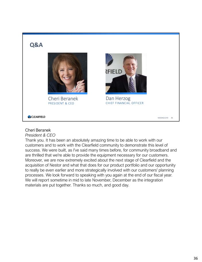 Q&A NASDAQ:CLFD 35 Cheri Beranek PRESIDENT & CEO Dan Herzog CHIEF FINANCIAL OFFICER Tim Savageaux Northland Capital Markets, Research Division Great. Thanks very much, and congrats again. Cheri Beranek President & CEO Thank you. Operator Thank you. At this time, this concludes the company's question - and - answer session. If your question was not taken, you may contact Clearfield's Investor Relations team at CLFD@gatewayir.com. I'd now like to turn the call back over to Ms. Beranek for closing remarks. Over to you, ma'am. 35