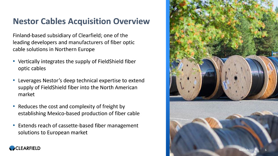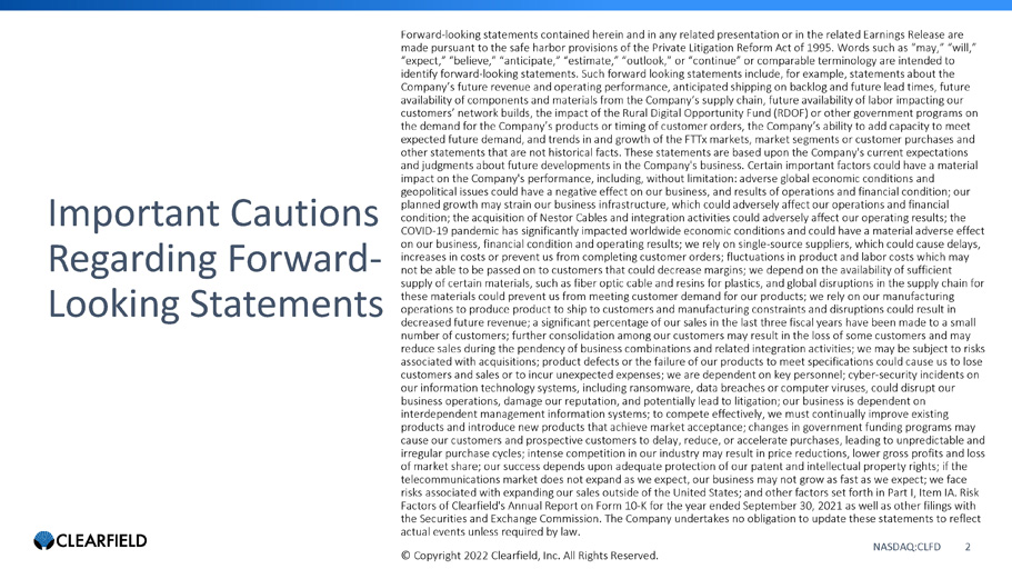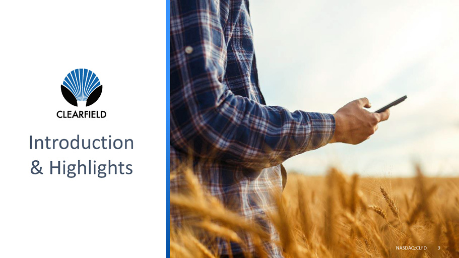 Important Cautions Regarding Forward - Looking Statements NASDAQ:CLFD 2 Forward - looking statements contained herein and in any related presentation or in the related Earnings Release are made pursuant to the safe harbor provisions of the Private Litigation Reform Act of 1995. Words such as “may,” “will,” “expect,” “believe,” “anticipate,” “estimate,” “outlook,” or “continue” or comparable terminology are intended to identify forward - looking statements. Such forward looking statements include, for example, statements about the Company’s future revenue and operating performance, anticipated shipping on backlog and future lead times, future availability of components and materials from the Company’s supply chain, future availability of labor impacting our customers’ network builds, the impact of the Rural Digital Opportunity Fund (RDOF) or other government programs on the demand for the Company’s products or timing of customer orders, the Company’s ability to add capacity to meet expected future demand, and trends in and growth of the FTTx markets, market segments or customer purchases and other statements that are not historical facts. These statements are based upon the Company's current expectations and judgments about future developments in the Company's business. Certain important factors could have a material impact on the Company's performance, including, without limitation: adverse global economic conditions and geopolitical issues could have a negative effect on our business, and results of operations and financial condition; our planned growth may strain our business infrastructure, which could adversely affect our operations and financial condition; the acquisition of Nestor Cables and integration activities could adversely affect our operating results; the COVID - 19 pandemic has significantly impacted worldwide economic conditions and could have a material adverse effect on our business, financial condition and operating results; we rely on single - source suppliers, which could cause delays, increases in costs or prevent us from completing customer orders; fluctuations in product and labor costs which may not be able to be passed on to customers that could decrease margins; we depend on the availability of sufficient supply of certain materials, such as fiber optic cable and resins for plastics, and global disruptions in the supply chain fo r these materials could prevent us from meeting customer demand for our products; we rely on our manufacturing operations to produce product to ship to customers and manufacturing constraints and disruptions could result in decreased future revenue; a significant percentage of our sales in the last three fiscal years have been made to a small number of customers; further consolidation among our customers may result in the loss of some customers and may reduce sales during the pendency of business combinations and related integration activities; we may be subject to risks associated with acquisitions; product defects or the failure of our products to meet specifications could cause us to lose customers and sales or to incur unexpected expenses; we are dependent on key personnel; cyber - security incidents on our information technology systems, including ransomware, data breaches or computer viruses, could disrupt our business operations, damage our reputation, and potentially lead to litigation; our business is dependent on interdependent management information systems; to compete effectively, we must continually improve existing products and introduce new products that achieve market acceptance; changes in government funding programs may cause our customers and prospective customers to delay, reduce, or accelerate purchases, leading to unpredictable and irregular purchase cycles; intense competition in our industry may result in price reductions, lower gross profits and loss of market share; our success depends upon adequate protection of our patent and intellectual property rights; if the telecommunications market does not expand as we expect, our business may not grow as fast as we expect; we face risks associated with expanding our sales outside of the United States; and other factors set forth in Part I, Item IA. Risk Factors of Clearfield's Annual Report on Form 10 - K for the year ended September 30, 2021 as well as other filings with the Securities and Exchange Commission. The Company undertakes no obligation to update these statements to reflect actual events unless required by law. © Copyright 2022 Clearfield, Inc. All Rights Reserved.