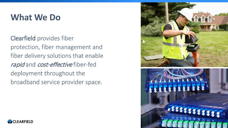 What We Do Clearfield provides fiber protection, fiber management and fiber delivery solutions that enable rapid and cost - effective fiber - fed deployment throughout the broadband service provider space. NASDAQ:CLFD 5