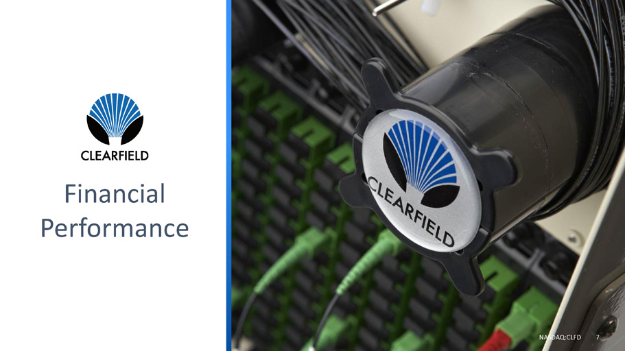NASDAQ:CLFD 6 Nestor Cables Acquisition Overview Finland - based subsidiary of Clearfield; one of the leading developers and manufacturers of fiber optic cable solutions in Northern Europe • Vertically integrates the supply of FieldShield fiber optic cables • Leverages Nestor’s deep technical expertise to extend supply of FieldShield fiber into the North American market • Reduces the cost and complexity of freight by establishing Mexico - based production of fiber cable • Extends reach of cassette - based fiber management solutions to European market