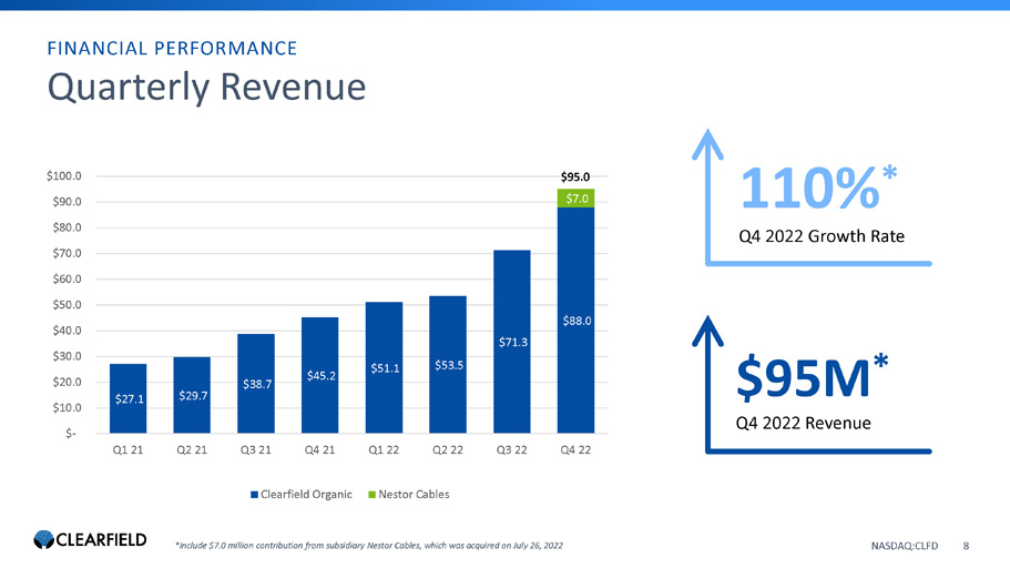 Quarterly Revenue $27.1 $29.7 $38.7 $45.2 $51.1 $53.5 $71.3 $88.0 $7.0 $- $10.0 $20.0 $30.0 $40.0 $50.0 $60.0 $70.0 $80.0 $90.0 $100.0 Q1 21 Q2 21 Q3 21 Q4 21 Q1 22 Q2 22 Q3 22 Q4 22 Clearfield Organic Nestor Cables FINANCIAL PERFORMANCE 110% * Q4 2022 Growth Rate $95M * Q4 2022 Revenue NASDAQ:CLFD 8 *Include $7.0 million contribution from subsidiary Nestor Cables, which was acquired on July 26, 2022 $95.0