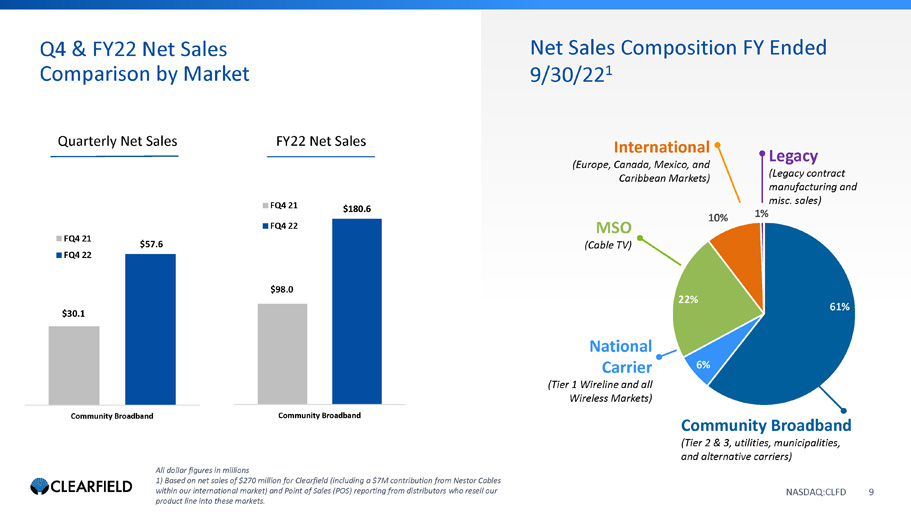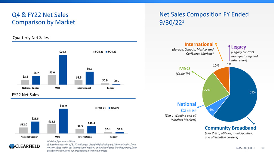 Q4 & FY22 Net Sales Comparison by Market NASDAQ:CLFD All dollar figures in millions 1) Based on net sales of $270 million for Clearfield (including a $7M contribution from Nestor Cables within our international market) and Point of Sales (POS) reporting from distributors who resell our product line into these markets. Net Sales Composition FY Ended 9/30/22 1 Legacy (Legacy contract manufacturing and misc. sales) 61% 6% 22% 10% 1% $98.0 $180.6 Community Broadband FQ4 21 FQ4 22 Quarterly Net Sales FY22 Net Sales Community Broadband (Tier 2 & 3, utilities, municipalities, and alternative carriers) National Carrier (Tier 1 Wireline and all Wireless Markets) MSO (Cable TV) International (Europe, Canada, Mexico, and Caribbean Markets) NASDAQ:CLFD 9 $30.1 $57.6 Community Broadband FQ4 21 FQ4 22