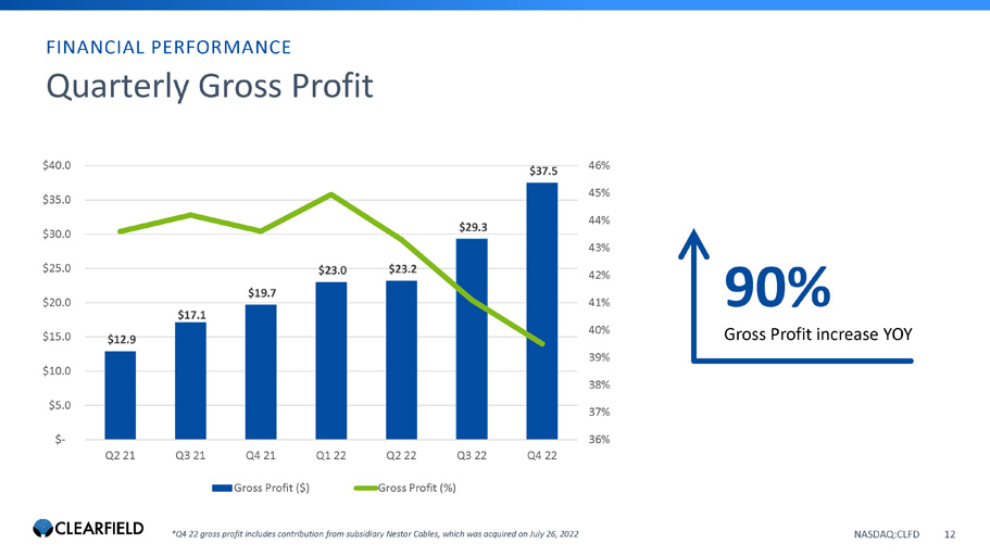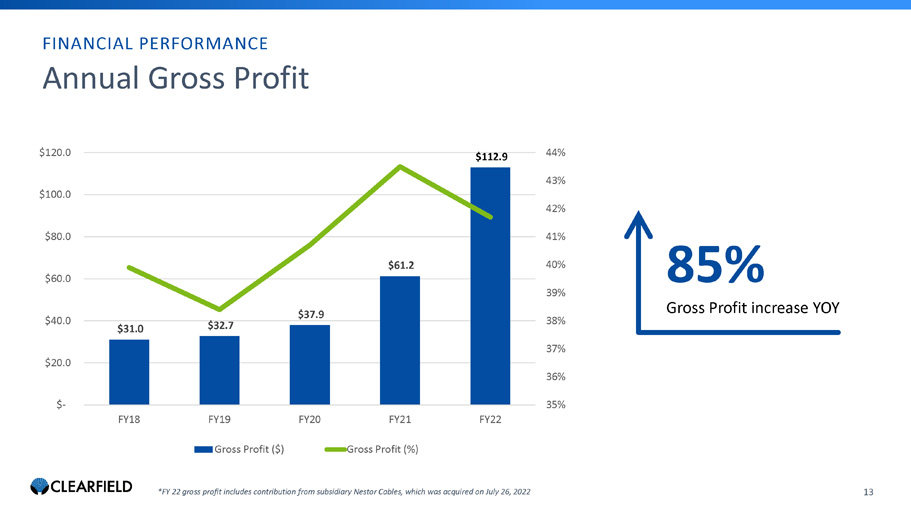 Quarterly Gross Profit $12.9 $17.1 $19.7 $23.0 $23.2 $29.3 $37.5 36% 37% 38% 39% 40% 41% 42% 43% 44% 45% 46% $- $5.0 $10.0 $15.0 $20.0 $25.0 $30.0 $35.0 $40.0 Q2 21 Q3 21 Q4 21 Q1 22 Q2 22 Q3 22 Q4 22 Gross Profit ($) Gross Profit (%) FINANCIAL PERFORMANCE 90% Gross Profit increase YOY NASDAQ:CLFD 12 *Q4 22 gross profit includes contribution from subsidiary Nestor Cables, which was acquired on July 26, 2022