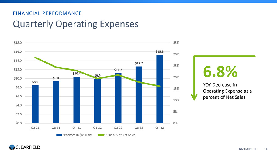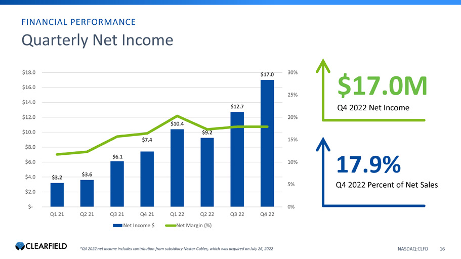 Annual Operating Expense $25.9 $27.5 $29.5 $35.9 $49.1 0% 5% 10% 15% 20% 25% 30% 35% 40% $- $10.0 $20.0 $30.0 $40.0 $50.0 $60.0 FY18 FY19 FY20 FY21 FY22 Expenses in $Millions OP as a % of Net Sales FINANCIAL PERFORMANCE NASDAQ:CLFD 15
