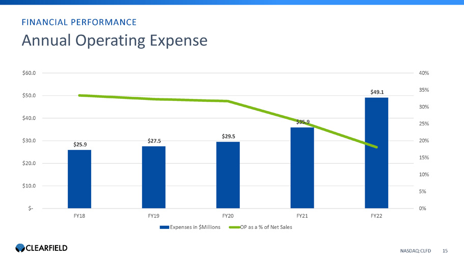 $8.5 $9.4 $10.4 $9.9 $11.2 $12.7 $15.3 0% 5% 10% 15% 20% 25% 30% 35% $0.0 $2.0 $4.0 $6.0 $8.0 $10.0 $12.0 $14.0 $16.0 $18.0 Q2 21 Q3 21 Q4 21 Q1 22 Q2 22 Q3 22 Q4 22 Expenses in $Millions OP as a % of Net Sales FINANCIAL PERFORMANCE 6.8% YOY Decrease in Operating Expense as a percent of Net Sales NASDAQ:CLFD 14 Quarterly Operating Expenses